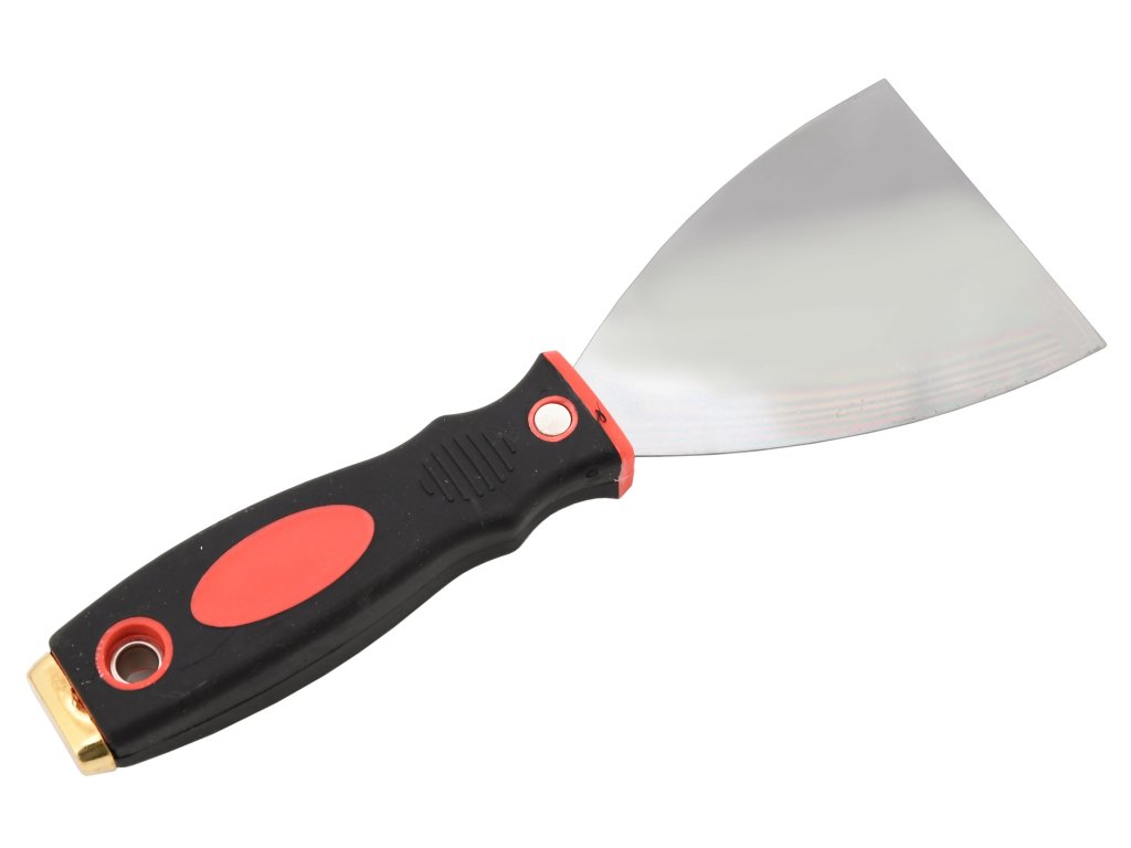 Špachtle (80 mm) z nerezové leštěné oceli s ergonomickou rukojetí a úderníkem, pokrytou dvěmi vrstvami barevného plastu různé tvrdosti zajíšťující pevný úchop.