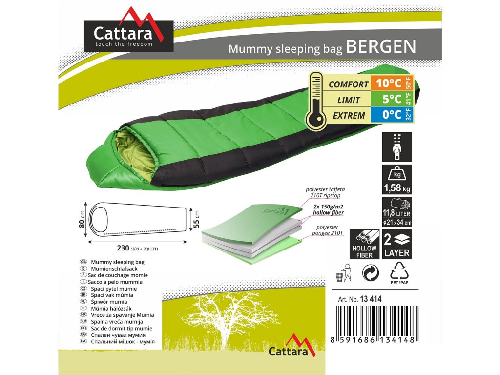 Spací pytel mumie Bergen, je spacákem, který dokonale kopíruje tělo a má tak nejlepší tepelně izolační vlastnosti a je vybaven zatažitelnou kapucí chránící hlavu.
