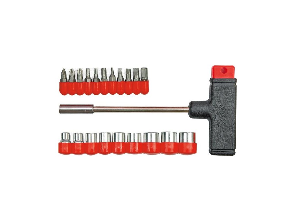 Šroubovák ve tvaru T v sadě nástrčnými klíči a bity. Díky speciálně tvarované rukojeti ve tvaru T vám nebude šroubovák prokluzovat v dlani, na rozdíl od běžných šroubováků, ani při větším záběru.