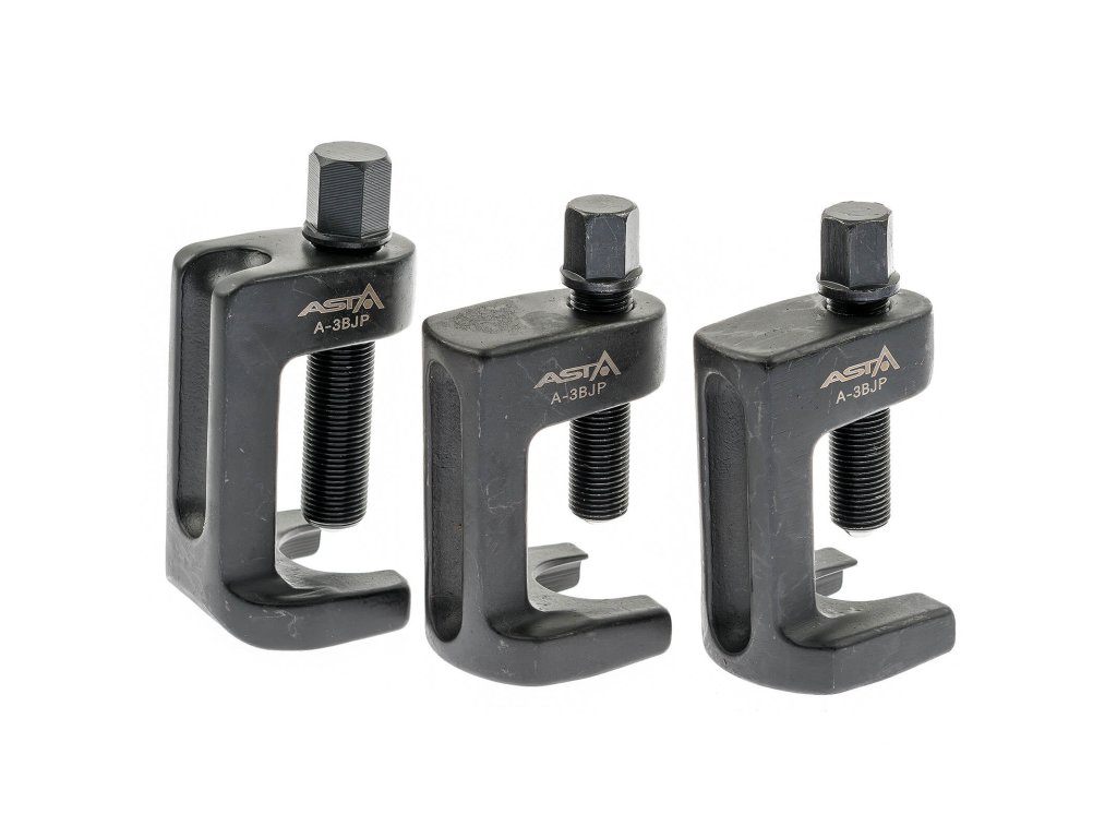 Sada 3 univerzálních stahováků na kulové čepy (tzv. kulové klouby) ASTA A-3BJP Vhodné zejména pro práci v úzkých prostorech. Konce šroubů jsou vybaveny kuličkou, která snižuje tření mezi nimi a kloubem – čepem. Demontovanému prvku díky tomu nehrozí poškození, zvyšuje se i životnost stahováku (šroub se při práci tolik neodírá). Velikosti stahováků (rozsah čelistí x vnitřní výška): 23 x 55 mm, 6hran pro klíč 17 mm 28 x 55 mm, 6hran pro klíč 17 mm 34 x 63 mm, 6hran pro klíč 19 mm Kvalitní provedení: vyrobeno z chrom-molybdenové (Cr-Mo) oceli. Možno použít i s rázovým utahovákem. Balení: plastový kufříkDoplňkové parametry