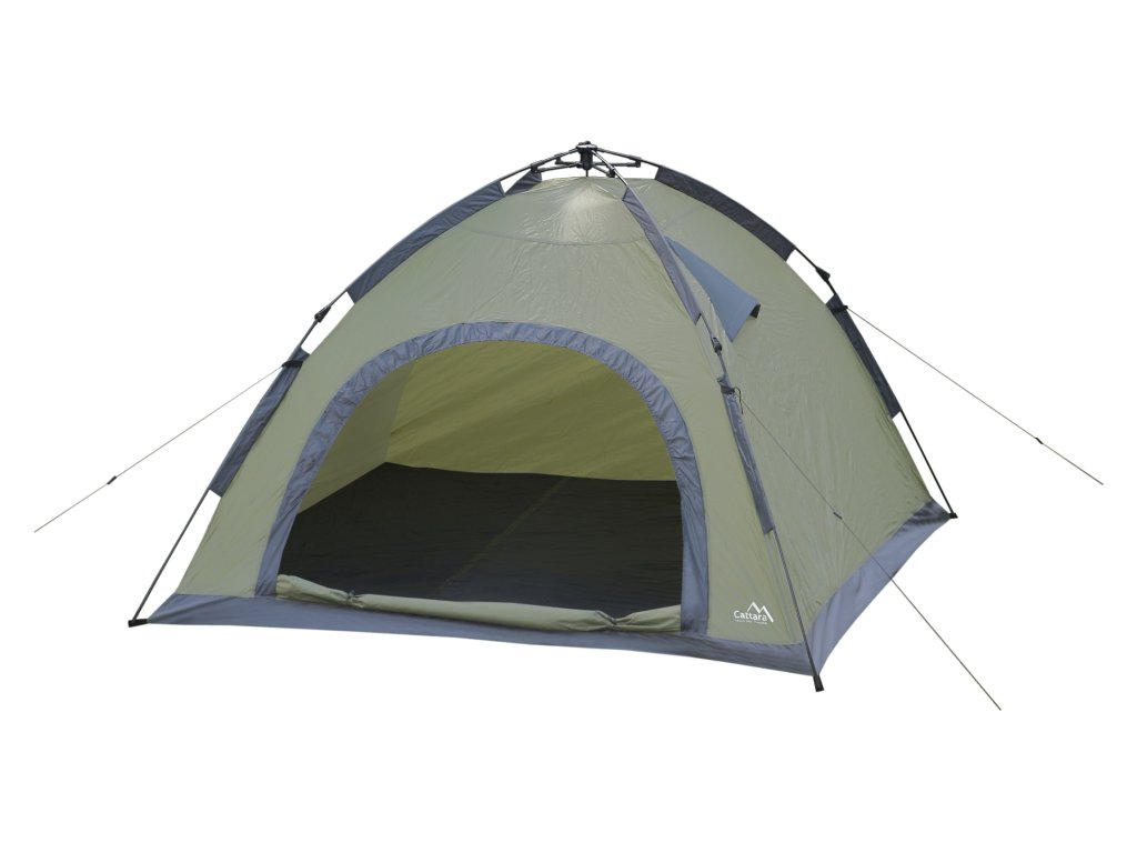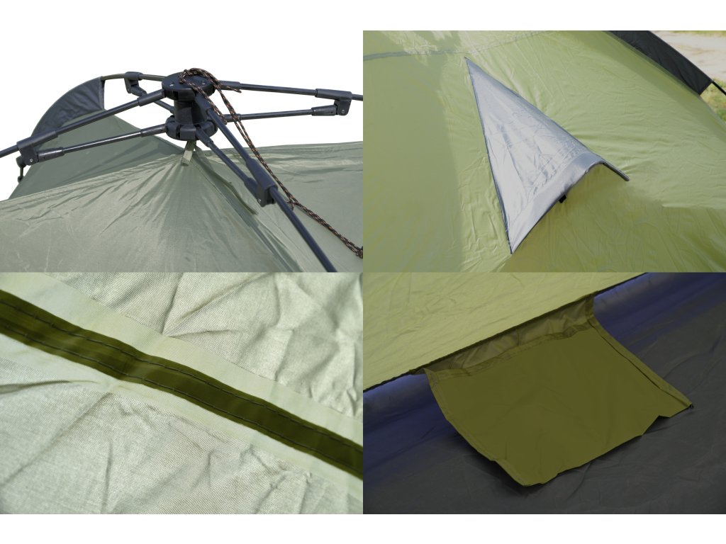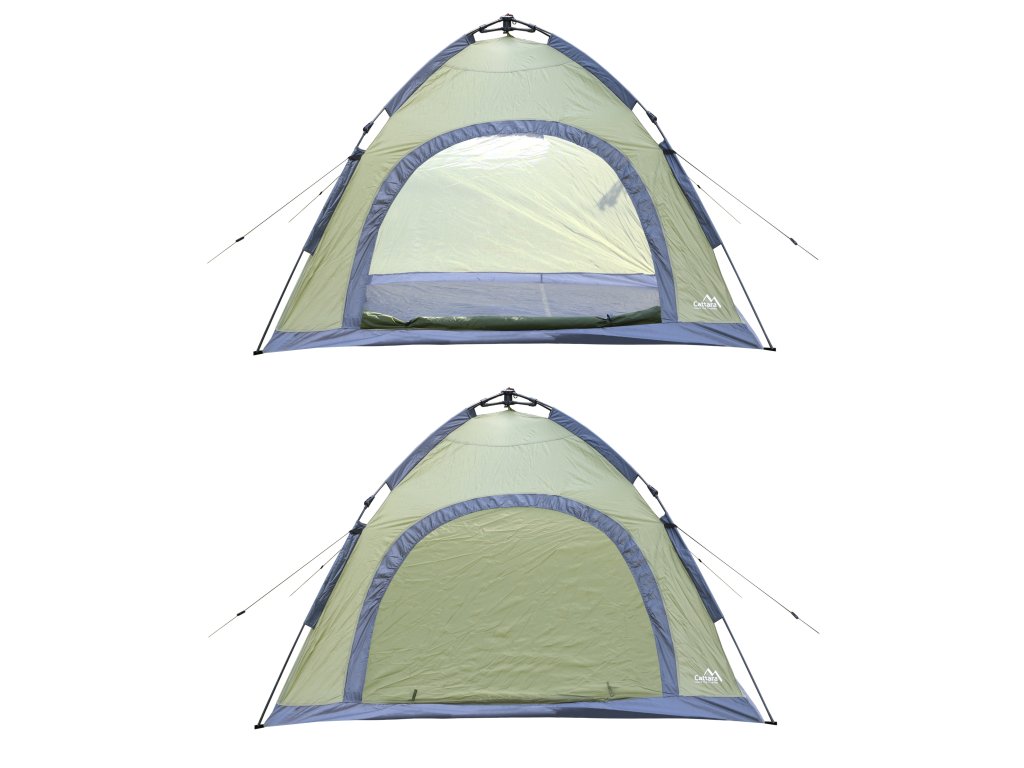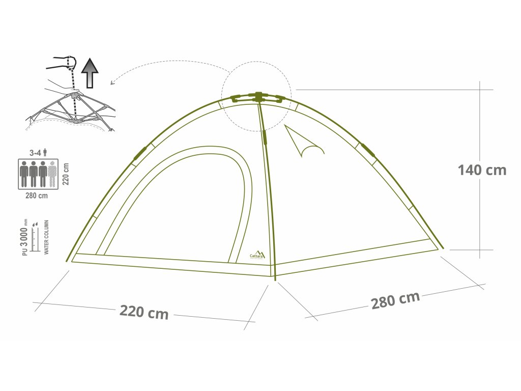 Rychle sestavitelný, voděodolný stan do jakéhokoliv počasí, o rozměrech 280 x 220 cm a výšce 140 cm, vhodný pro 3-4 osoby.