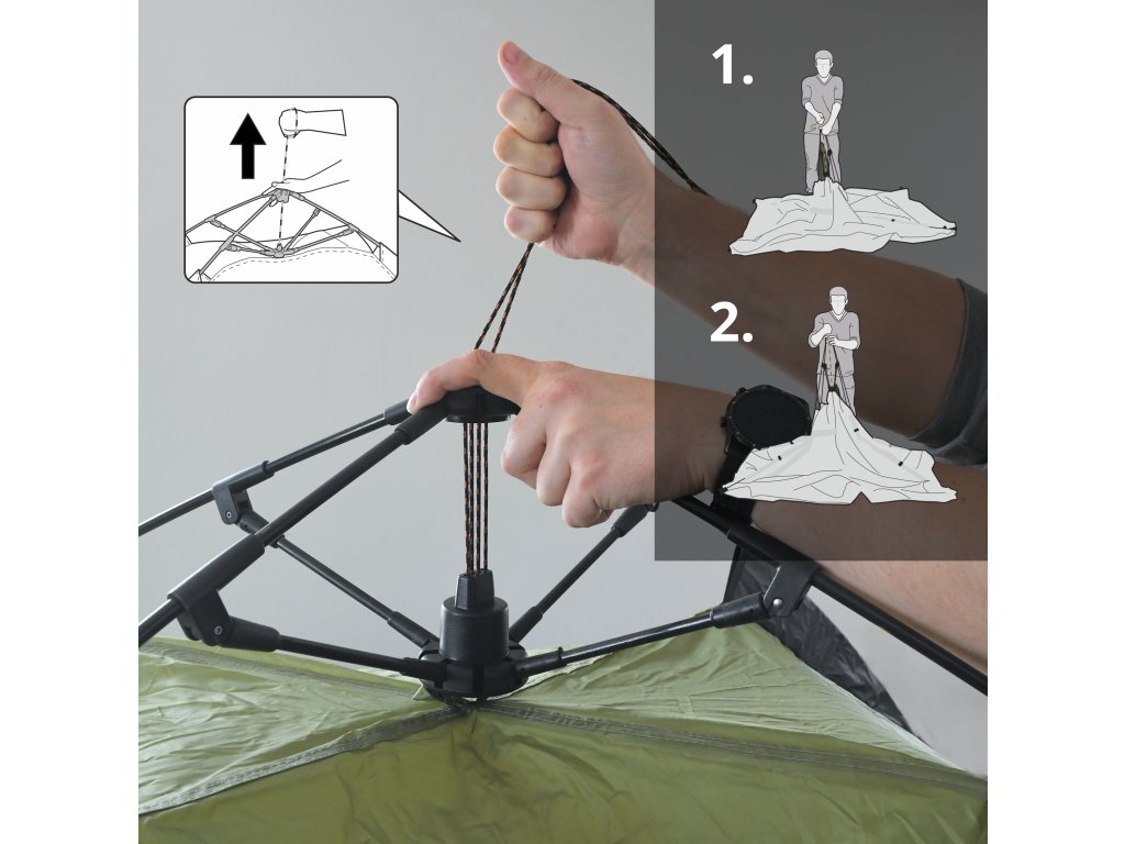 Stan je opatřen unikátním systémem, významně zkracujícím dobu sestavení. Stan se pouze rozloží do prostoru a za pomocí mechanismu (tahem nahoru) a následným zajištěním se sestaví do finální podoby. Stan je poté možné standartně zajistit pomocí kolíků. Pro složení stačí povolit mechanismus a stan uschovat do přepravního balení.