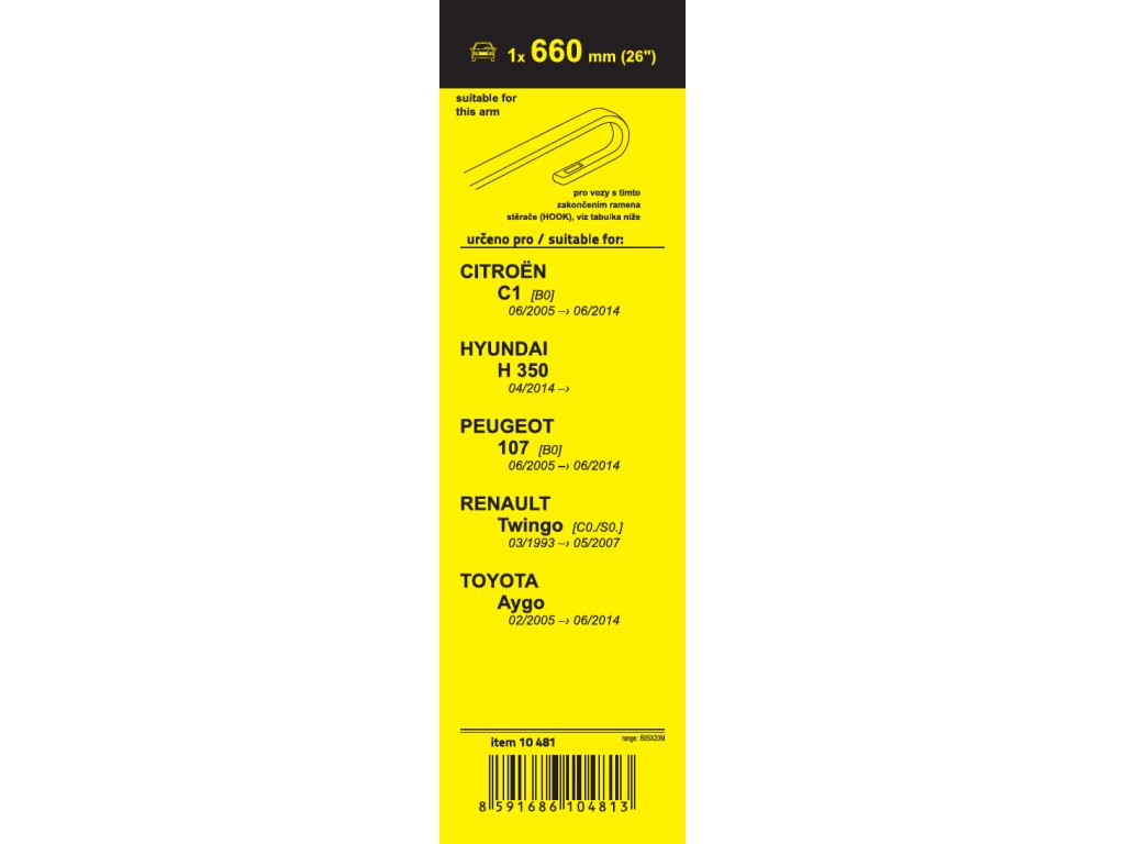 Plochý stěrač FLAT (na přední okno) se speciálním uchycením. Délka stěrače a systém uchycení na ramínko je přizpůsobena vybraným vozům (viz tabulka použití).