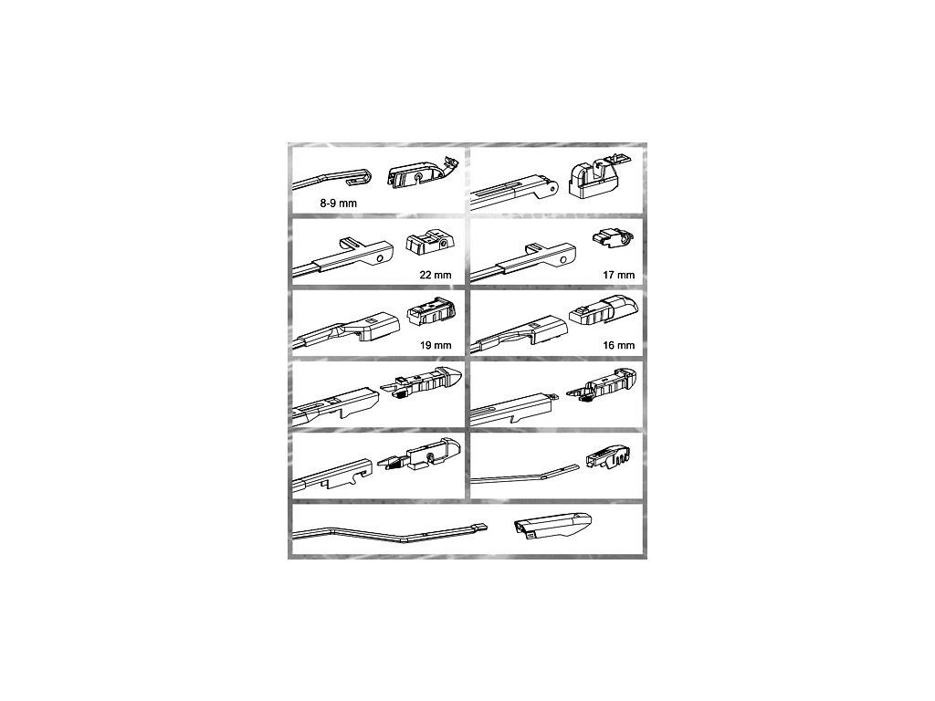 Balení obsahuje 11 adaptérů, díky kterým je snadné stěrač upevnit na většinu běžně používaných zakončení ramének stěračů, včetně nejnovějších vozů. Tento typ stěrače umožňuje výměnu gumičky (břitu).