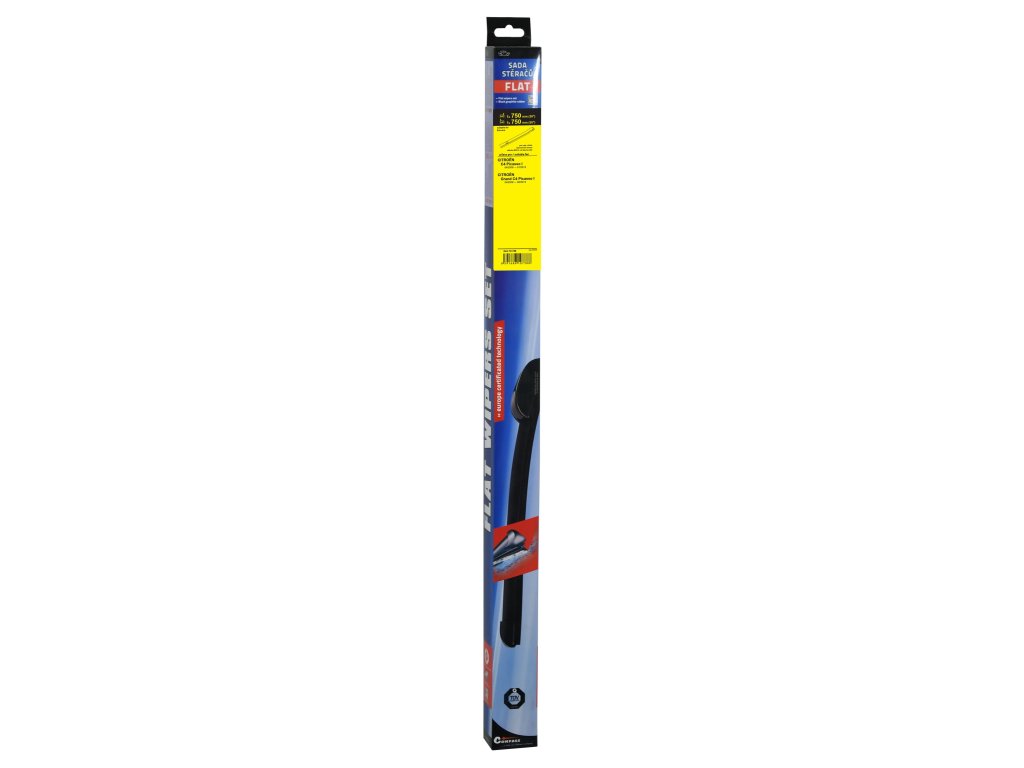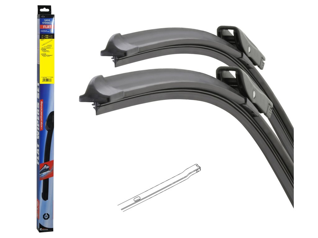 Sada dvou plochých stěračů FLAT (řidič + spolujezdec) se speciálním uchycením. Délky stěračů a systém uchycení na ramínko jsou přizpůsobeny vybraným vozům (viz tabulka použití).