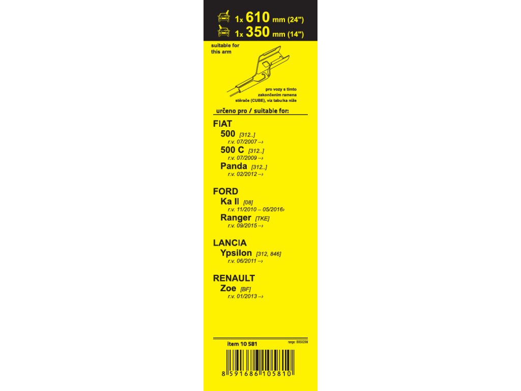 Sada dvou plochých stěračů FLAT (řidič + spolujezdec) se speciálním uchycením. Délky stěračů a systém uchycení na ramínko jsou přizpůsobeny vybraným vozům (viz tabulka použití).