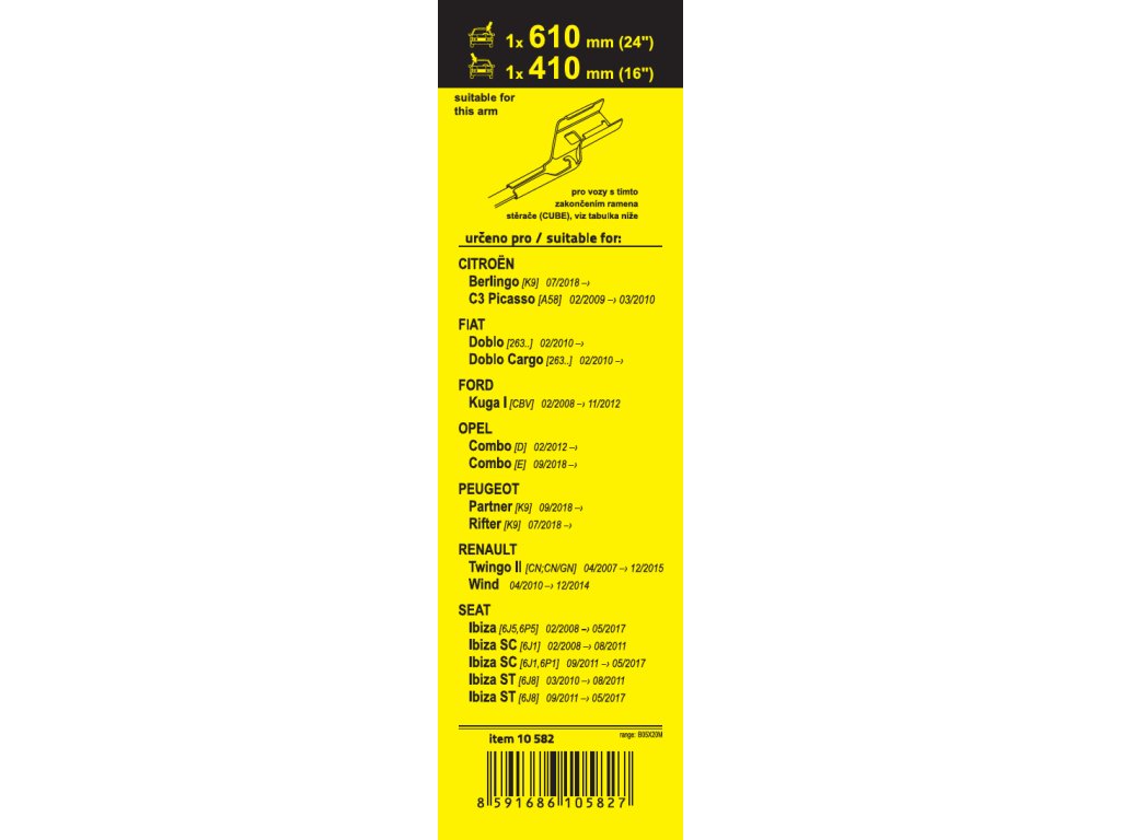 Sada dvou plochých stěračů FLAT (řidič + spolujezdec) se speciálním uchycením. Délky stěračů a systém uchycení na ramínko jsou přizpůsobeny vybraným vozům (viz tabulka použití).