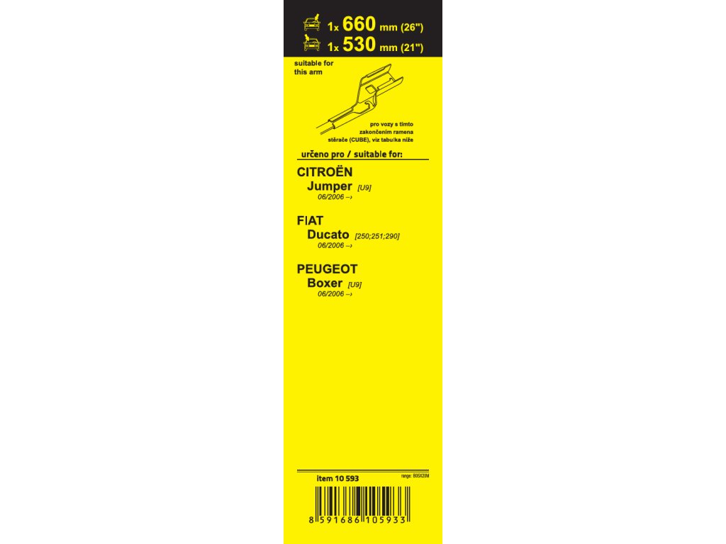 Sada dvou plochých stěračů FLAT (řidič + spolujezdec) se speciálním uchycením. Délky stěračů a systém uchycení na ramínko jsou přizpůsobeny vybraným vozům (viz tabulka použití).