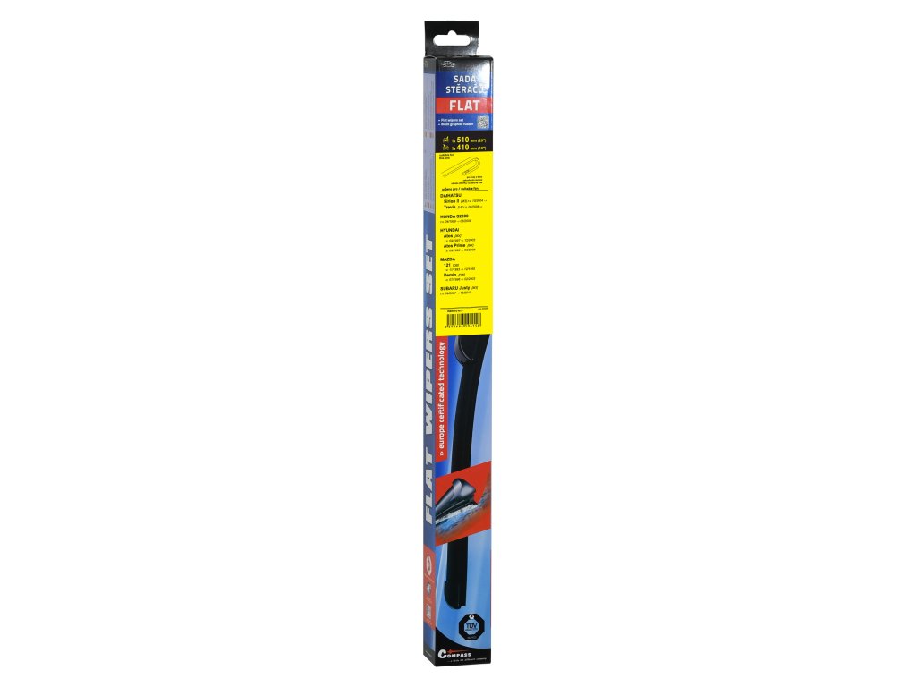 Sada dvou plochých stěračů FLAT (řidič + spolujezdec) se speciálním uchycením. Délky stěračů a systém uchycení na ramínko jsou přizpůsobeny vybraným vozům (viz tabulka použití).