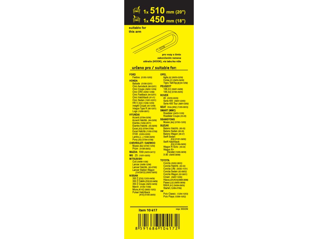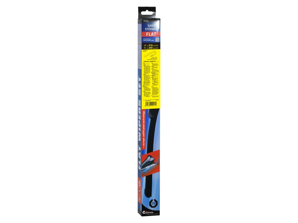 Sada dvou plochých stěračů FLAT (řidič + spolujezdec) se speciálním uchycením. Délky stěračů a systém uchycení na ramínko jsou přizpůsobeny vybraným vozům (viz tabulka použití).