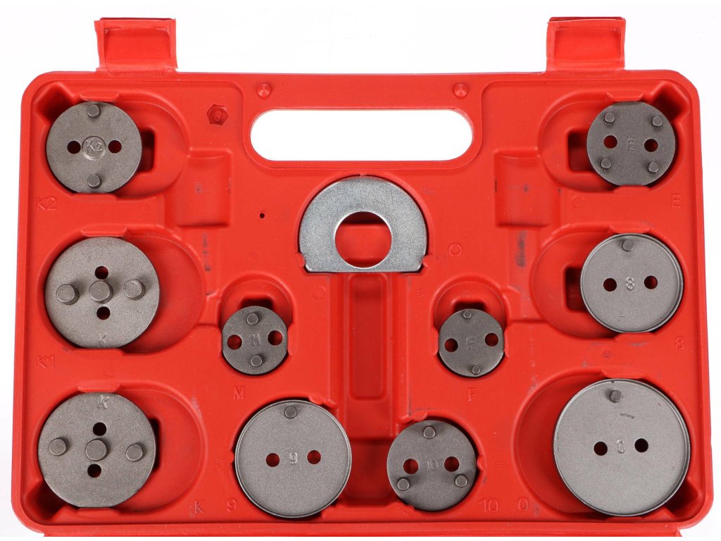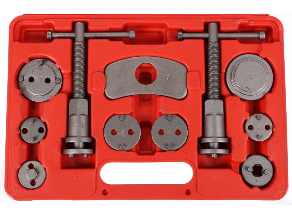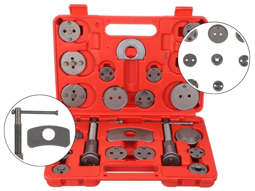 Univerzální sada stlačováků brzdových pístů BRAKE SET s 22 díly v plastovém kufru vhodná k montáži/zpětnému vracení pístů/třmenů kotoučových brzd. Sada obsahuje pravotočivou i levotočivou stlačovací závitnici s magnetem, dva dorazy a 18 různých adaptérů. U vozidel s třmeny kotoučových brzd a s integrovanou jednotkou ruční brzdy se zpětné vracení brzdových pístů provádí zpětným otáčením, u ostatních vozidel zpětným stlačením těchto pístů.