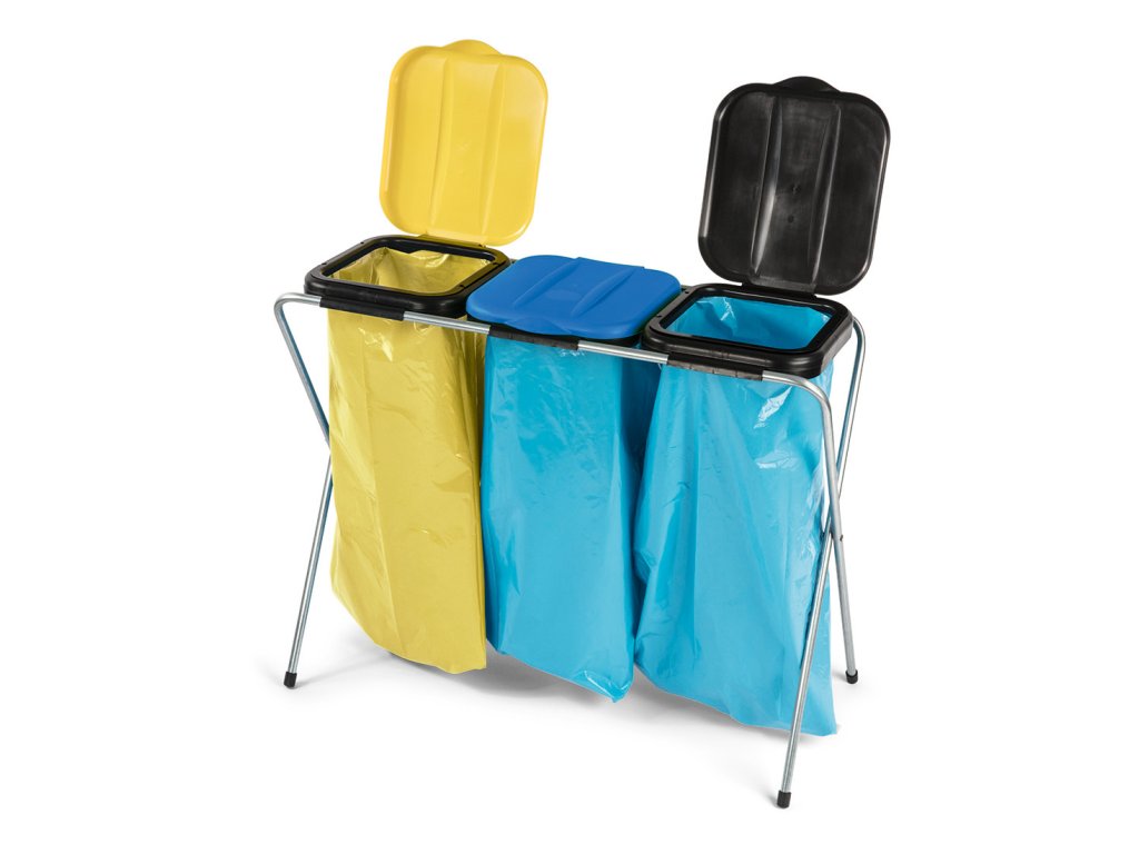 Praktický stojan na uchycení tří odpadkových pytlů naráz (např. s tříděným – plast a papír – a směsným odpadem). Sáčky se dovnitř snadno a rychle uchytí, po jeho naplnění se bez potíží vyndají ven. Vrchní víka (ve žluté, modré a černé barvě) zabraňují obsahu košů ve vylétávání ven. Ideální pro místa s mimořádně velkou produkcí odpadu (servisy, dílny, průmysl, ale i venkovní slavnosti apod.).