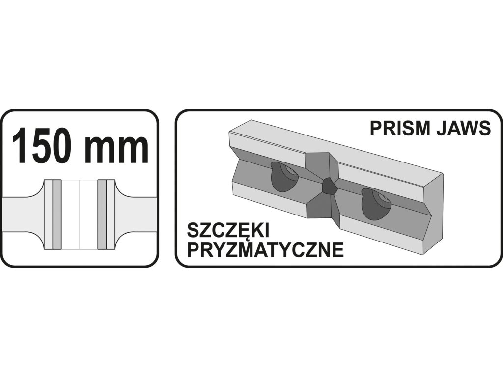 Strojní svěrák 150 mm, tělo z litiny. délka těla cca 160 mm. Montážní vzdálenost 135 mm, max. Vzdálenost čelistí 120 mm, Ocelové čelisti s hranolem, šroubem s rýhovanou rukojetí a uvolněným čepem.
