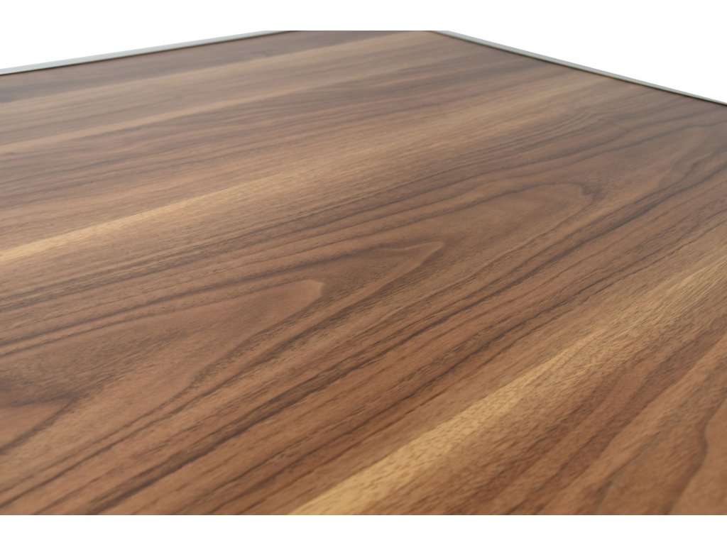 Stůl Double je skládací, teleskopický stůl z Aluminia, s rovnou plochou a vzorem kvalitně imitujícím dřevo.