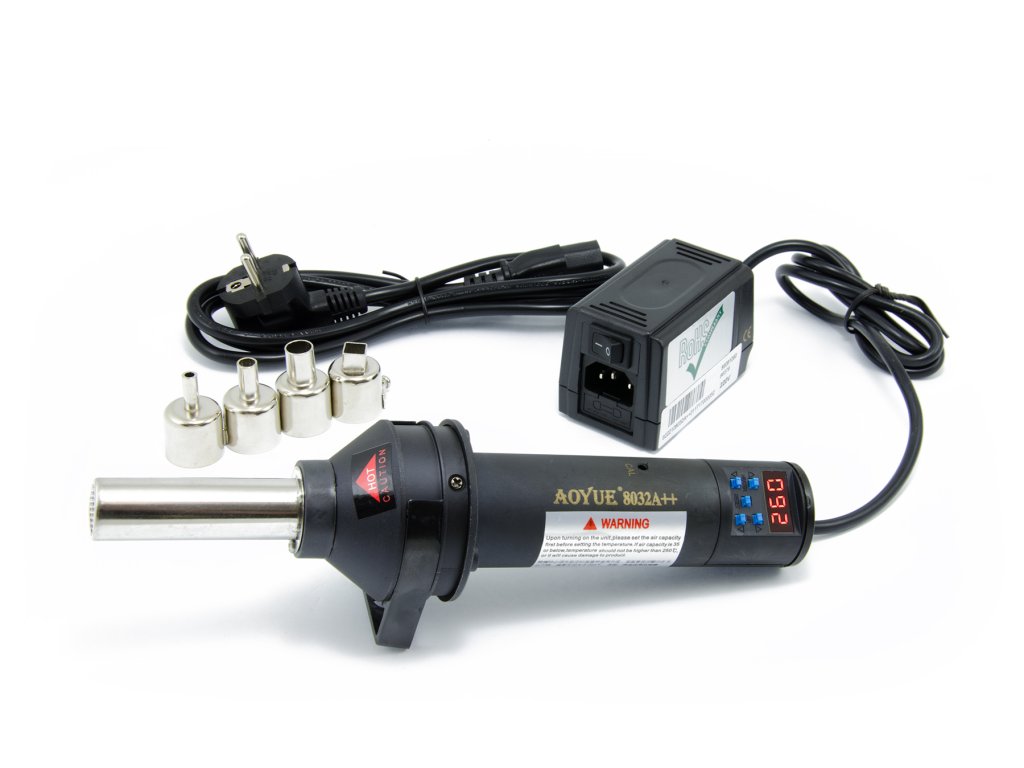 Horkovzdušná pájka – přístroj na svařování plastů s digitálním ovládáním a odkládacím stojánkem, v sadě se 4 nástavci.