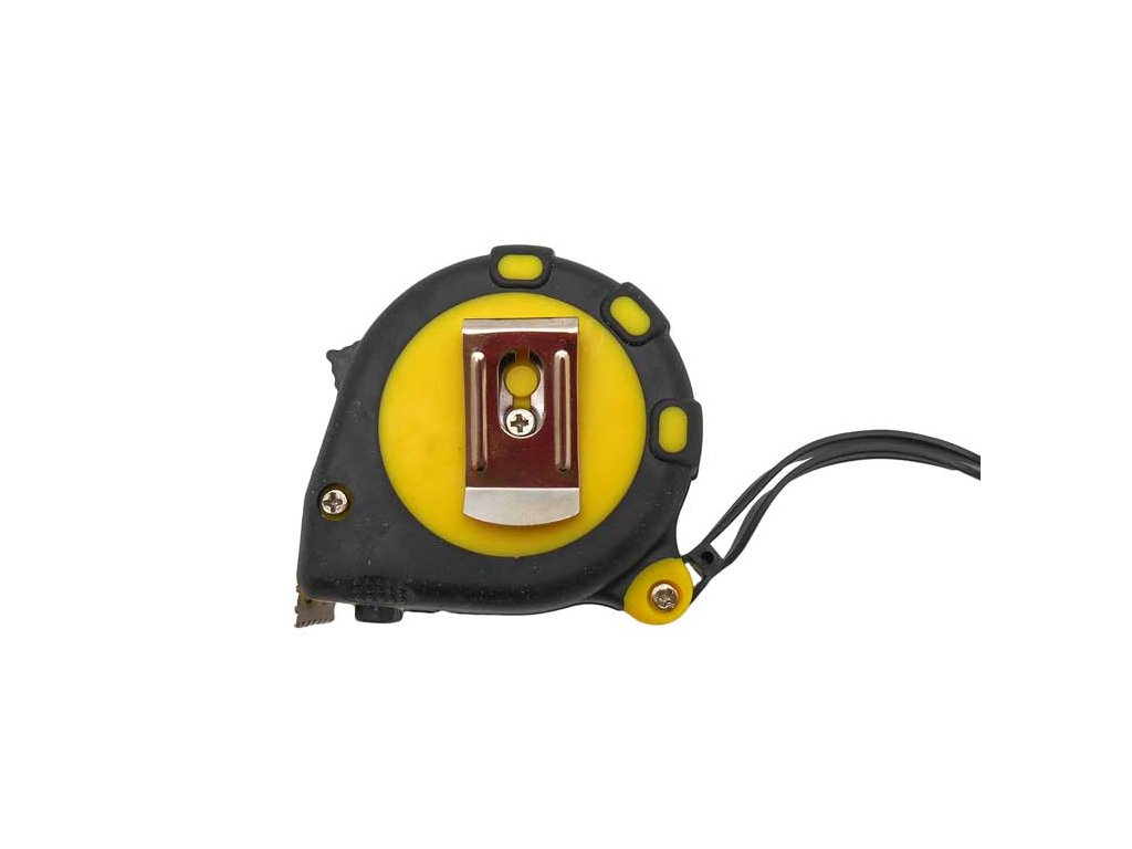 Pásmo měřicí – svinovací metr délky 750 cm a šířky 2,5 cm, s pogumovaným pouzdrem, magnetem a dvojím systémem aretace – MAGG LAND75 Klasický „metr“ vhodný hlavně pro měření venku. Díky dvoukomponentnímu obalu (plast/guma) s protiskluzovou úpravou je vhodný i pro použití za mokra. Koncový hák pásu je magnetický, díky čemuž lépe drží při zachycení. Pásmo je možné zajistit – zaaretovat dvěma způsoby: trvale pojistnou páčkou na čelní straně obalu nebo dočasně tlačítkem na boku (metr se zastaví po jeho stisknutí, po povolení se svine). Stupnice v milimetrech/centimetrech je dobře čitelná. Pro uchycení za pásek nebo na kapsu má metr silnou ocelovou sponu (klipsnu), pro zavěšení na zápěstí lze použít gumové poutko.Doplňkové parametry