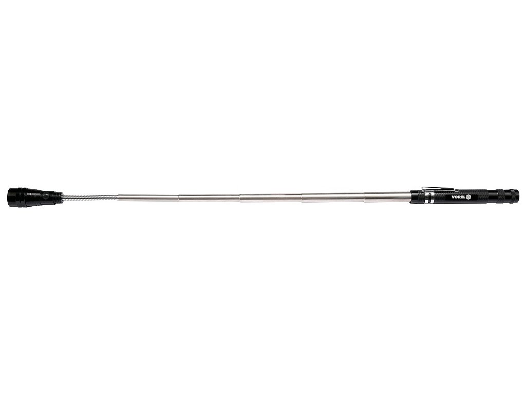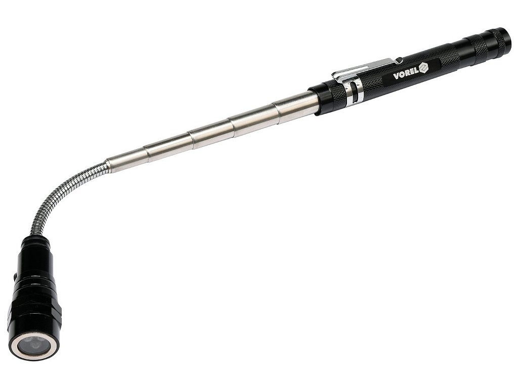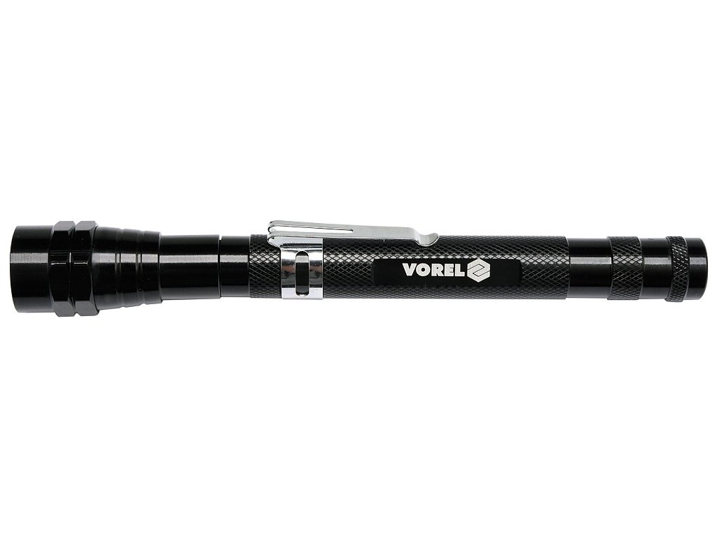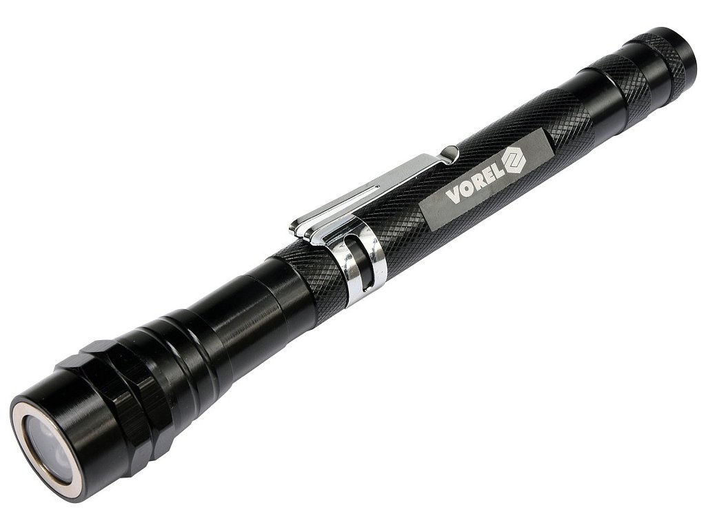 Celokovová teleskopická LED svítilna, s klipsem na opasek a s magnetem pro opevnění. Svítilna je v místě LED diod osazena magnetickým kroužkem, díky kterému lze snadno vytáhnout kovové předměty (např. šroubky) i z nepřístupných míst.