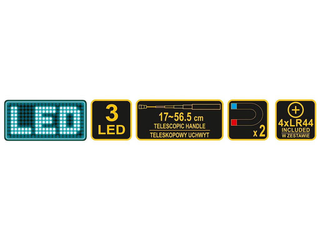 Svítilna je teleskopická (až 56,5 cm) a je vybavena ohebným krkem pro snadné přizpůsobení světla. Napájení 4x baterie LR44 (jsou součástí balení).