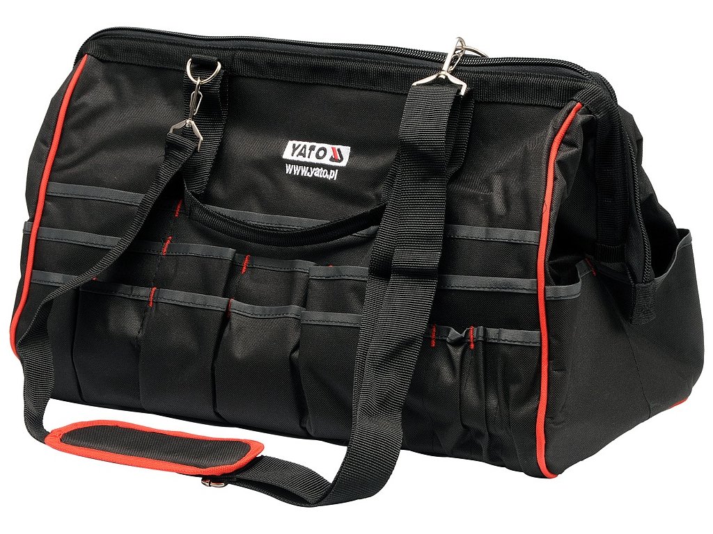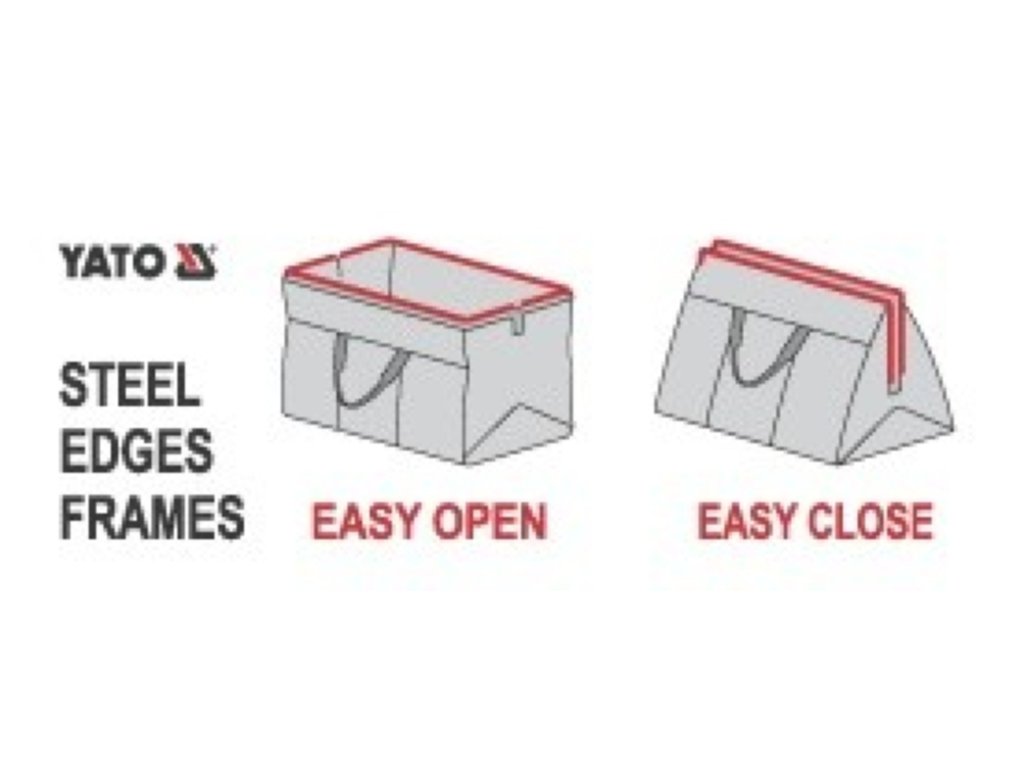 Praktická taška na nářadí YATO vyrobená z vylepšeného nylonu, vyztužená kovovou svorkou se závěsy pro snadné otevírání a zavírání.