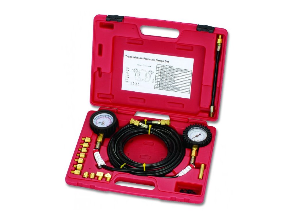 Tester na měření tlaku v automatických převodovkách – automatech ASTA TIT-130 Speciální přístroj – diagnostika na měření vysokého či nízkého tlaku oleje v automatické převodovce. Univerzální využití, určeno například pro vozidla značek: AMC, BMW, koncern Chrysler, Eagle, Jeep, Ford, koncern General Motors, Honda (Acura), Hyundai, Infiniti, Isuzu, Jaguar, Lexus, Mazda, Mercedes-Benz, Mitsubishi, Nissan, Peugeot, Saab, Saturn, Subaru, Suzuki, Toyota, Volkswagen, Volvo. Souprava obsahuje: 1x manometr s hadicí a rychlospojkou pro vysoké tlaky 1x manometr s hadicí a rychlospojkou pro nízké tlaky 1x pružná redukce 12x adaptér (rovné i zahnuté 45° a 90°) – pro připojení testeru k různým převodovkám Sada o-kroužků Dodáváno v plastovém kufříku.Doplňkové parametry