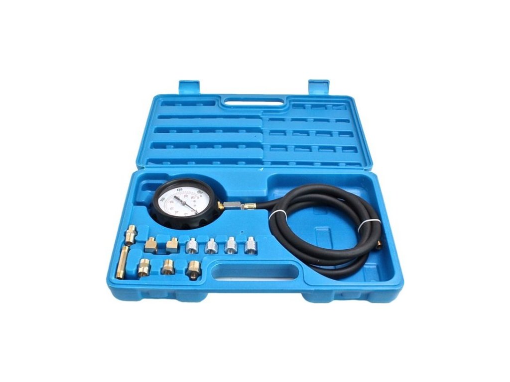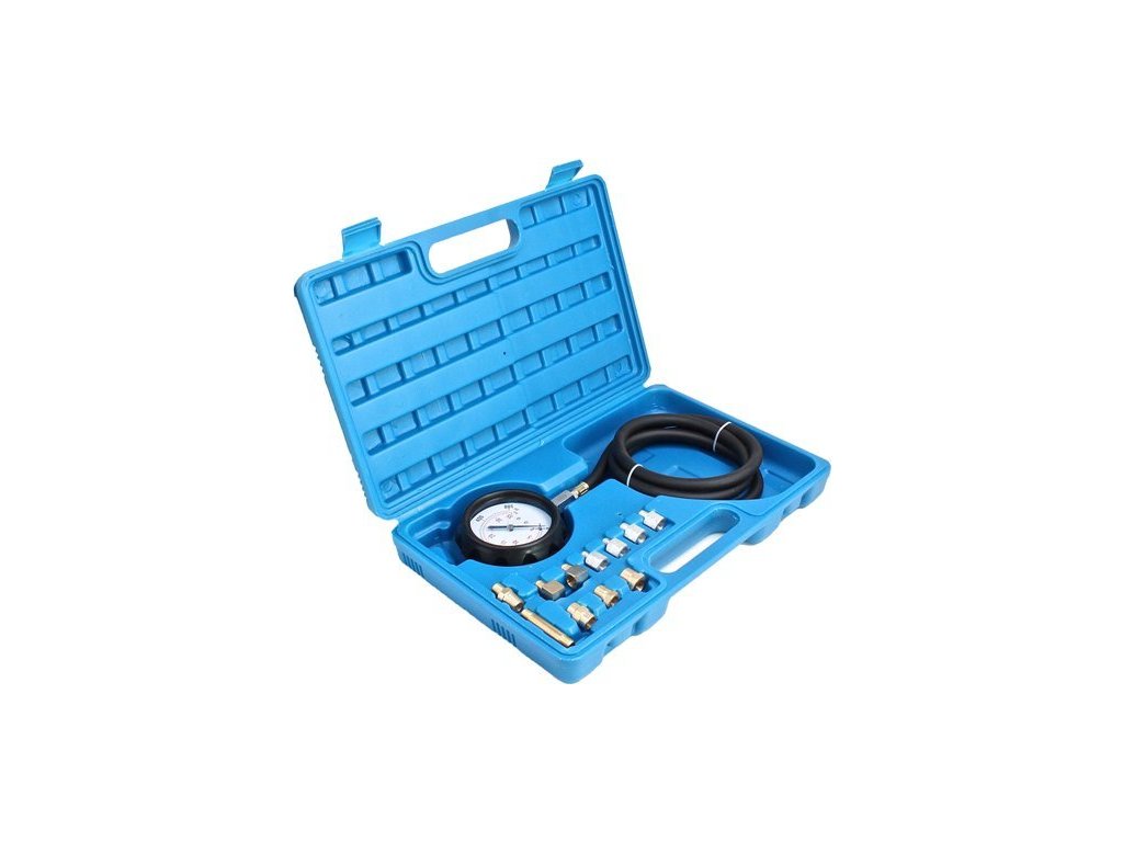 Přípravek – tester na měření tlaku oleje ATF v automatických převodovkách a motorového oleje SATRA S-AT24PT Univerzální nástroj pro kontrolu tlaku maziva v zážehových (benzinových) i vznětových (dieselových) motorech a převodovkách osobních i nákladních vozidel a zemědělských či pracovních strojů. Pomáhá diagnostikovat např. poškození olejových čerpadel, úniky ze systému s následnou ztrátou tlaku oleje atd. Obsah soupravy: - manometr s rozsahem 0 – 35 bar (0 – 500 psi), průměr 80 mm, s gumovou ochranou proti nárazům - flexibilní hadice odolná vůči olejům, délka 600 mm, závit 1/8“ NPT - 11x připojovací adaptér na motory či převodovky Dodáváno v plastovém kufříku.Doplňkové parametry