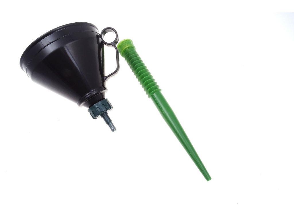 Nálevka – trychtýř s vnitřním sítkem na kapaliny Jonnesway AE300225 Průměr: 170 mm Objem: 1,2 litru Vhodné např. na benzín, naftu, řidší oleje a jiné provozní kapaliny. Ohebná nálevka (tzv. husí krk) celkové délky 350 mm pro pohodlné plnění. Součástí sady je i adaptér s hadičkou délky 600 mm a vnitřního průměru 9 mm, pomocí kterého lze kapalinu plnit i do velmi špatně přístupných míst. Adaptér je šroubovatelný na hrdlo trychtýře.Doplňkové parametry