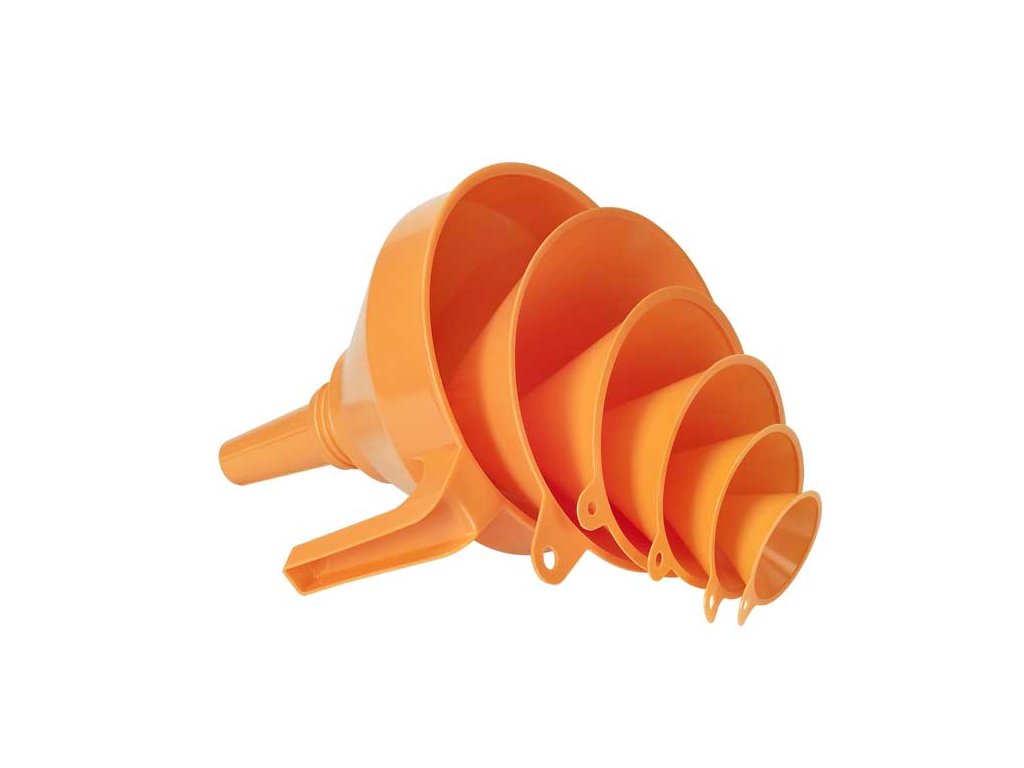 Sada trychtýřů, tzv. nálevek PRESSOL 02 372 043 Obsahuje 6 kusů průměrů: 50, 75, 100, 120, 150, 160 mm Objemy: 0,05; 0,09; 0,25; 0,27; 0,7; 1,2 litru Určeno např. pro pohodlné nalévání oleje do motoru, různých provozních kapalin apod. Největší trychtýř (průměr 160 mm) má vyjímatelné mosazné sítko, zabraňující pádu nečistot do nalévané kapaliny. Je vybaven postranním madlem pro pohodlné uchopení, menší nálevky mají očka. Vyrobeno z HDPE (vysokohustotního polyethylenu): dolné vůči oleji, kyselinám a naftě. Oranžová barva.Doplňkové parametry