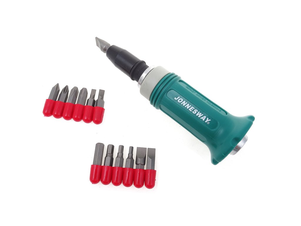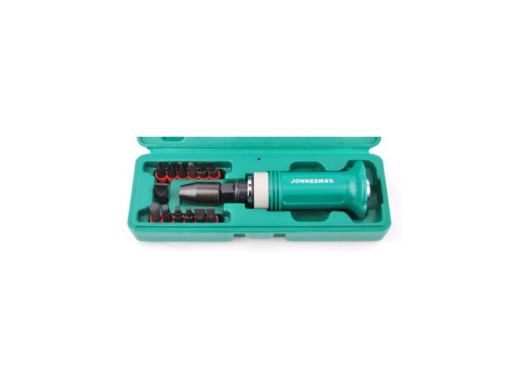 Úderový (rázový) šroubovák na povolování zatuhlých šroubů včetně bitů, vodící čtyřhran 1/2“, sada 15 ks, v plastovém pouzdru – JONNESWAY AG010138.
