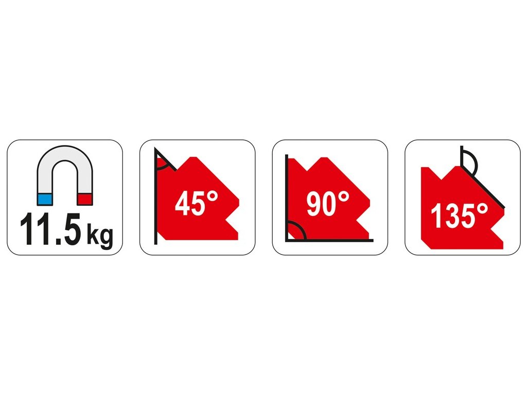 Umožňuje přesné spojování materiálů v úhlech 45°, 90° a 135°. Nosnost magnetu cca 11,5 kg. Povrchová úprava červené práškové lakování.