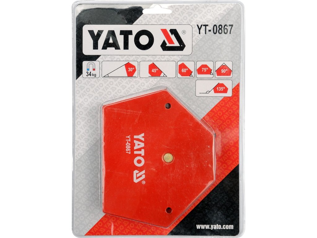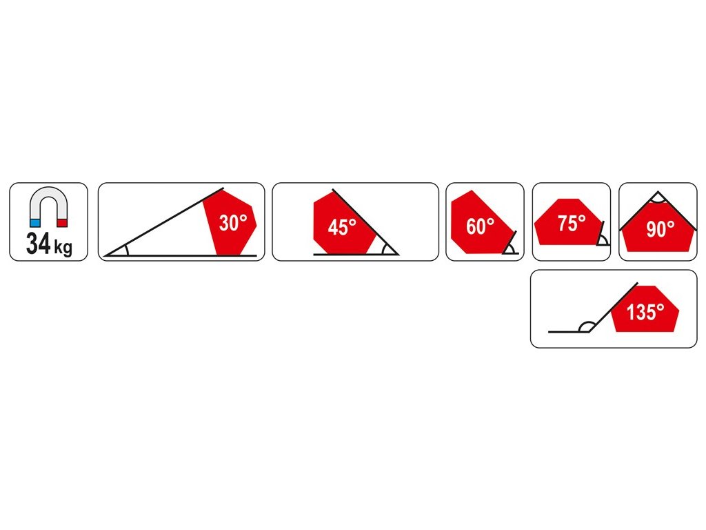 Umožňuje přesné spojování materiálů v úhlech 30°, 45°, 60°, 75°, 90° a 135°. Nosnost magnetu cca 34 kg. Povrchová úprava červené práškové lakování.