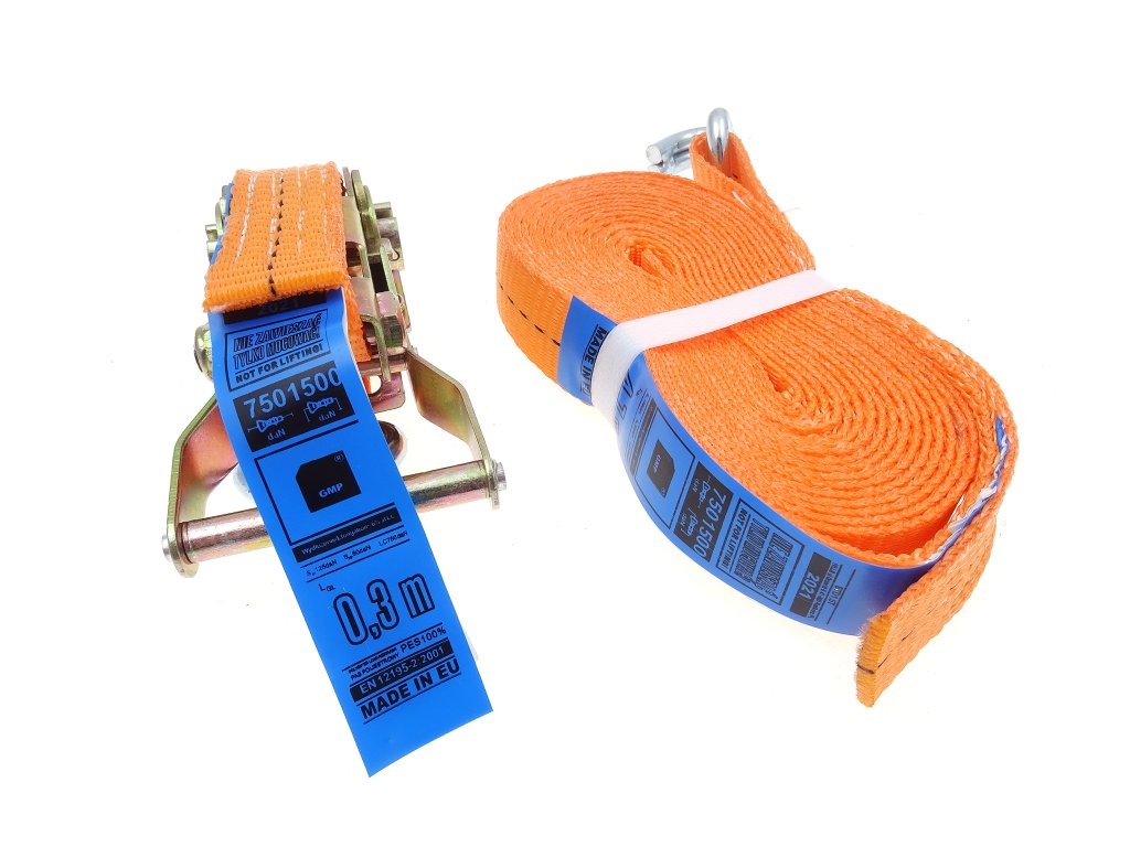 Upínací pás s ráčnou a kovovými háky, tzv. kurtna (kurta), dvoudílný, vázací síla 1500 kg, celková délka 500 cm – GMP