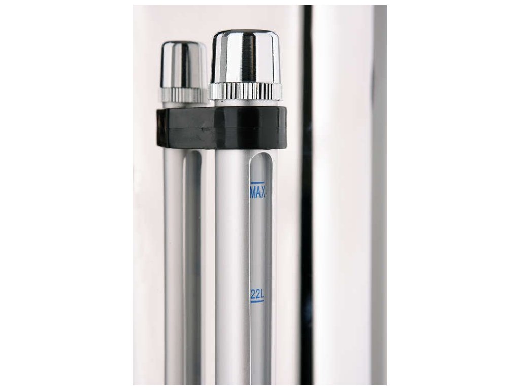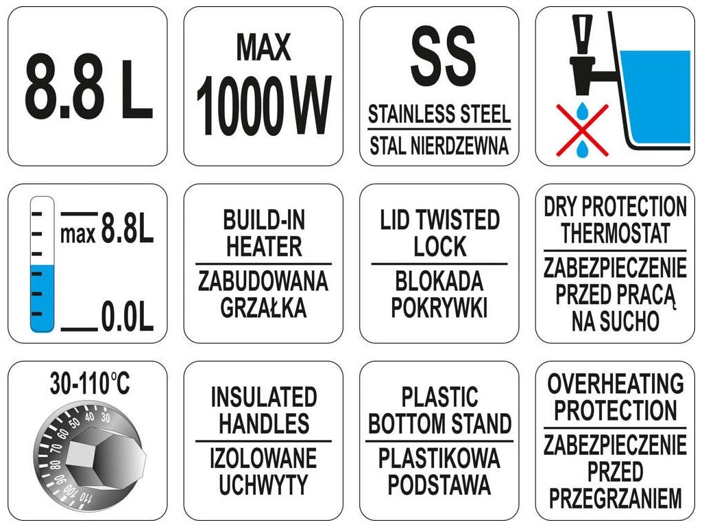 Sporák je nastavitelný v rozsahu 30 ~ 110 ° C. Na druhou stranu vestavěné kontrolky signalizují vytápění a udržování teploty. Přepínač umožňuje vypnout zařízení bez odpojení zástrčky ze zásuvky. Na vnější straně nádoby je ukazatel hladiny vody se stupnicí vyjádřenou v litrech. Po obou stranách jsou pohodlná, na dotek příjemná držadla. Jejich konstrukcí je také systém TWIST-LOCK, díky kterému je možné víko pevně zavřít.