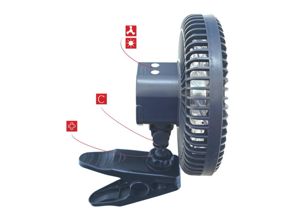 Tělo ventilátoru lze ve spodní části opatřit přiloženým kulovým kloubem, pomocí kterého lze ventilátor natočit do libovolného směru a pomocí jištěného mechanismu lze nastavit i sklon. Silný klips potom zajišťuje pevné a bezpečné uchycení na různém povrchu. Zadní část ventilátoru je navíc opatřena vyklápěcím držákem, díky kterému je možné zavěšení ventilátoru například na háček.