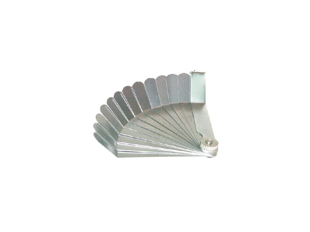 Měrky na ventily a spáry (tzv. spároměr), zahnuté – JMP 722.47.85 Palcové rozměry: 0,008“ - 0,010“ - 0,012“ - 0,013“ - 0,014“ - 0,015“ - 0,016“ - 0,018“ - 0,019“ - 0,020“ - 0,025“ - 0,026“ Metrické rozměry: 0,203 - 0,254 - 0,305 - 0,330 - 0,356 - 0,381 - 0,406 - 0,457 - 0,483 - 0,508 - 0,635 - 0,660 mm Úhel zahnutí: 30 stupňů Počet listů: 12 Zahnutý profil umožňuje měření i v hůře přístupných místech.Doplňkové parametry