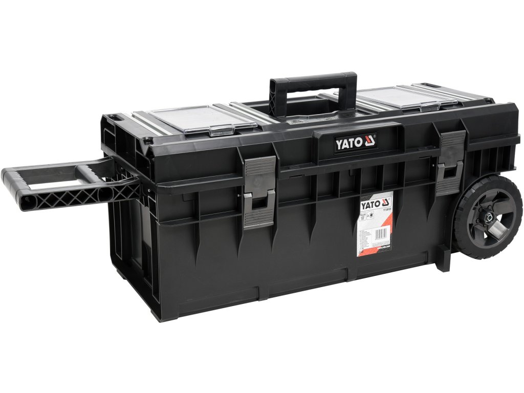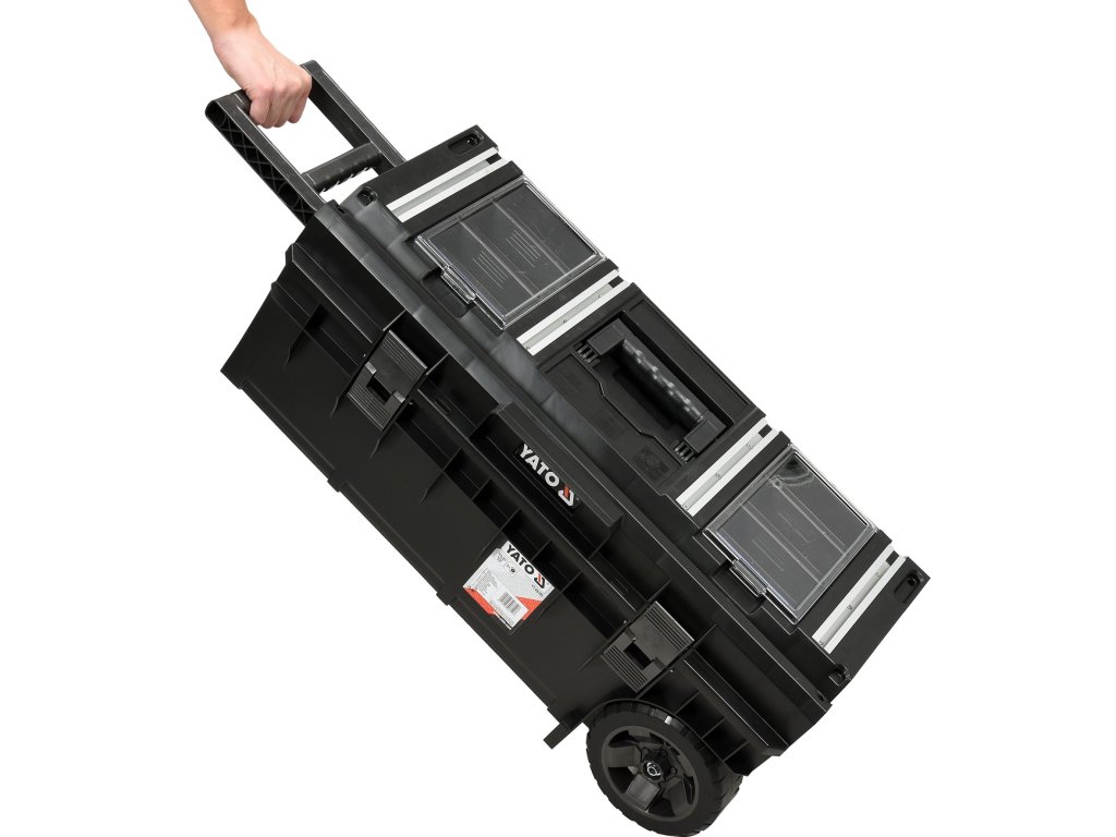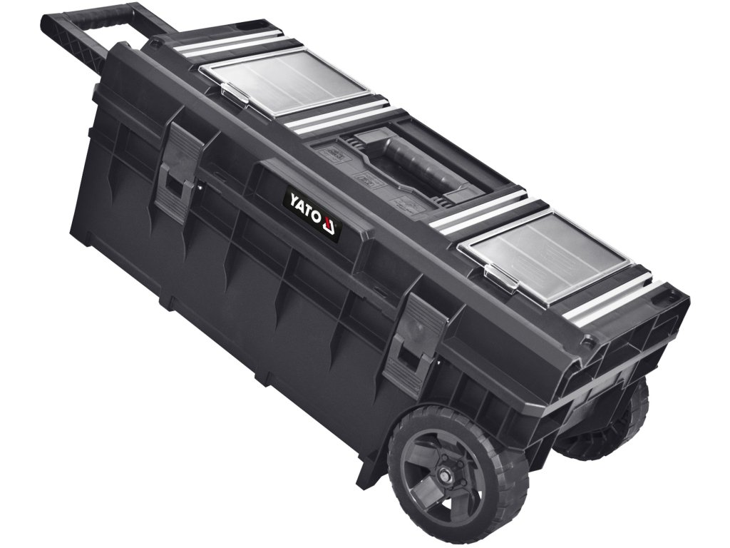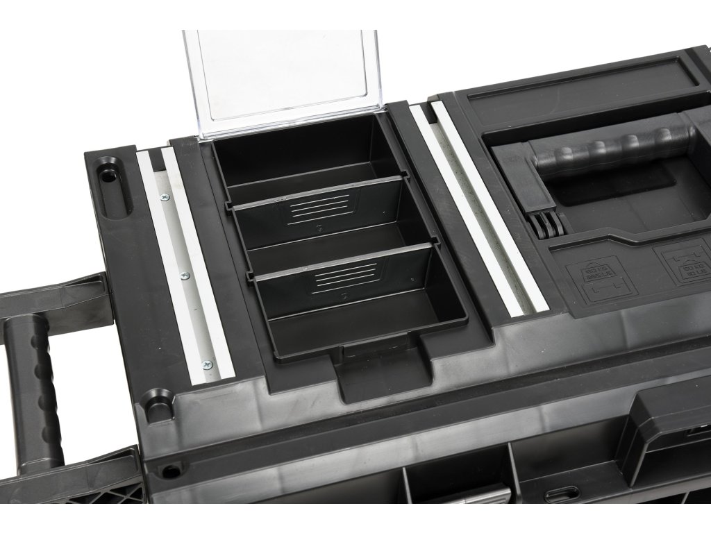 Pojízdný plastový kufr se dvěma organizéry ve víku s nastavitelnými přepážkami.