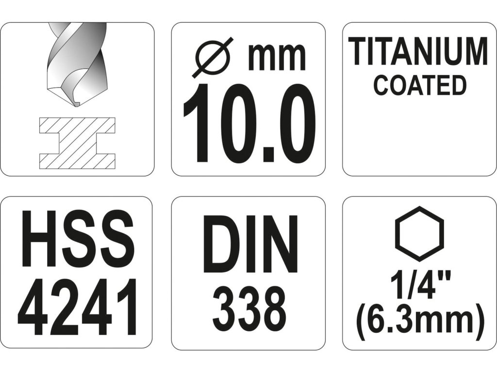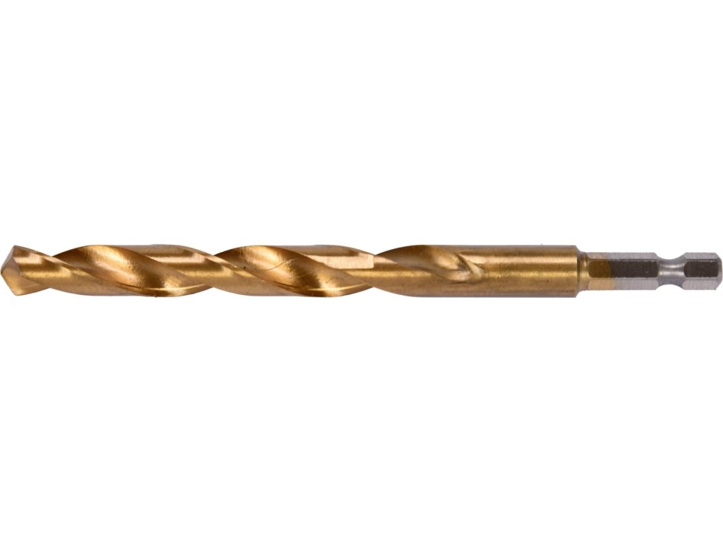 Vyrobeno z rychlořezné HSS oceli s Titanovým povlakem a vrcholovým úhlem 135°. Vrták je opatřen HEX 1/4" uchycením.