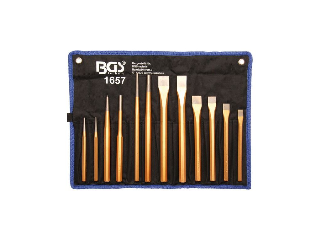 Nástroje na vyrážení, sekání a vytváření otvorů, zesílené, sada 12 dílů v látkovém obalu s očky pro zavěšení na stěnu – BGS technic 1657
