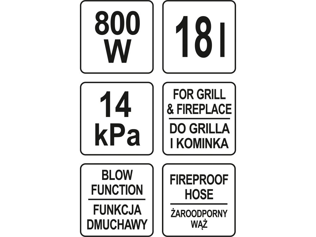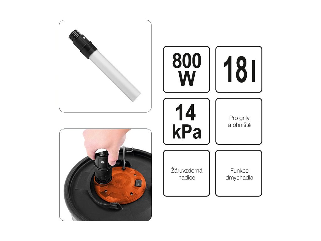 Sací hadice je tepelně odolná a je zakončena hliníkovou sací hubicí. Nádoba na popel je vyrobena z nerez oceli a její objem činí 18 litrů.