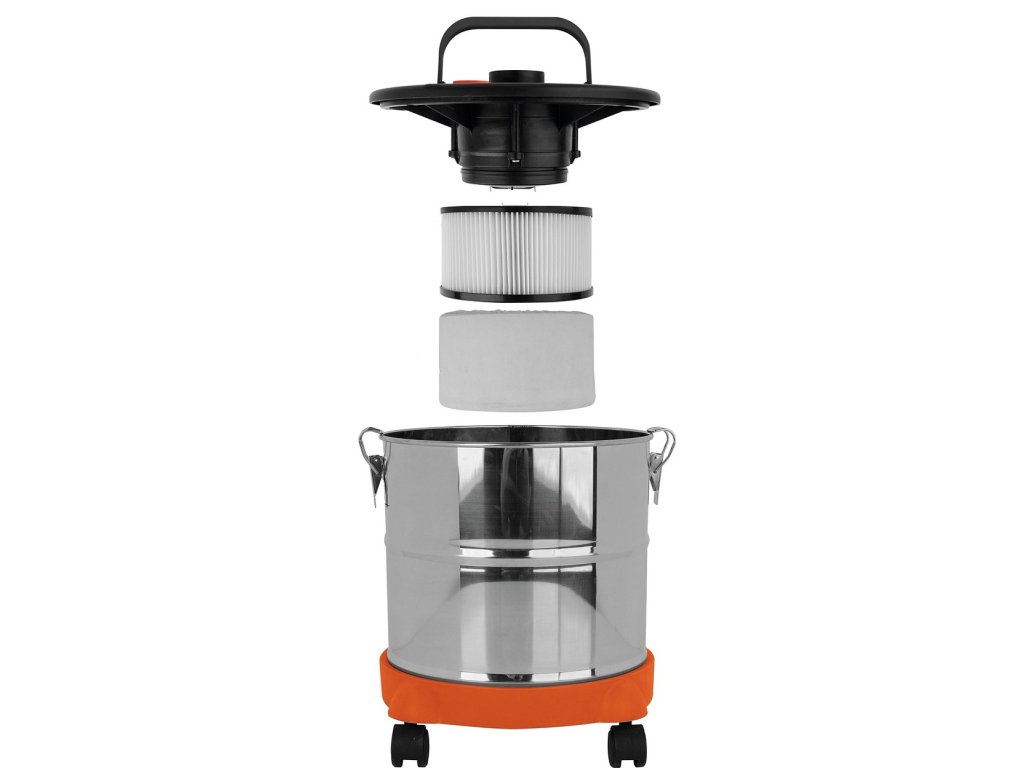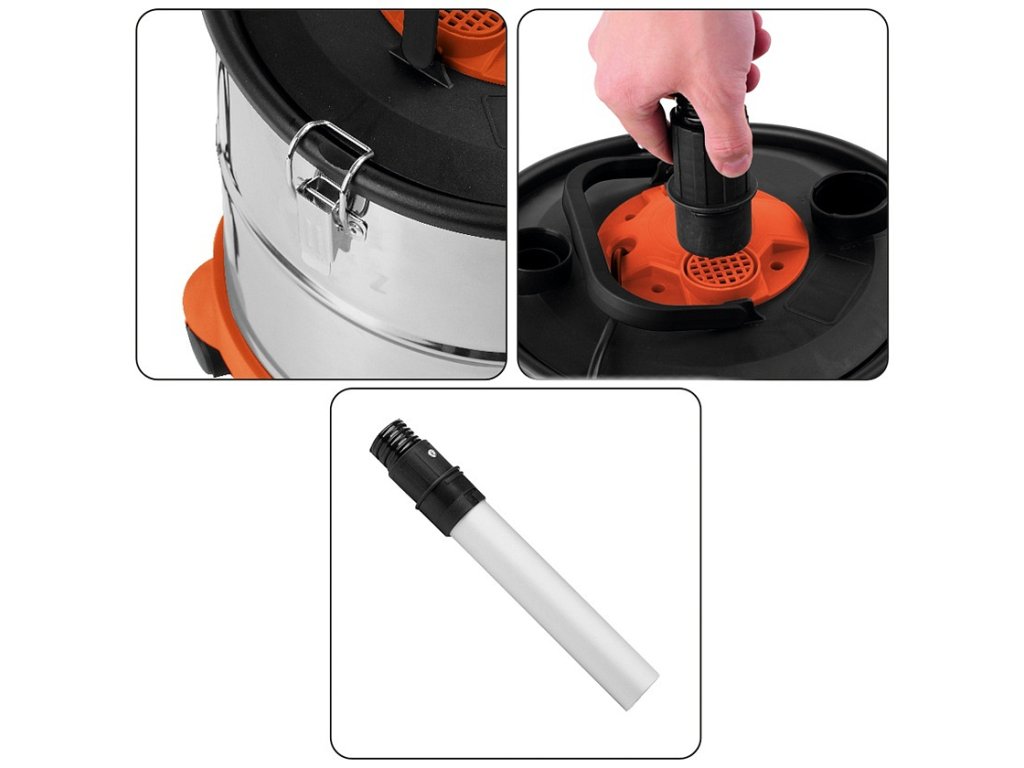 Sací hadice je tepelně odolná a je zakončena hliníkovou sací hubicí. Nádoba na popel je vyrobena z nerez oceli a její objem činí 20 litrů.