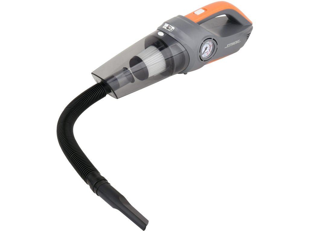 Přenosný vysavač s funkcí kompresoru, s dlouhým kabelem se zástrčkou do zásuvky automobilového zapalovače 12V.