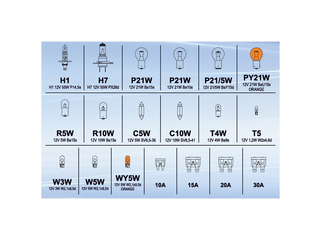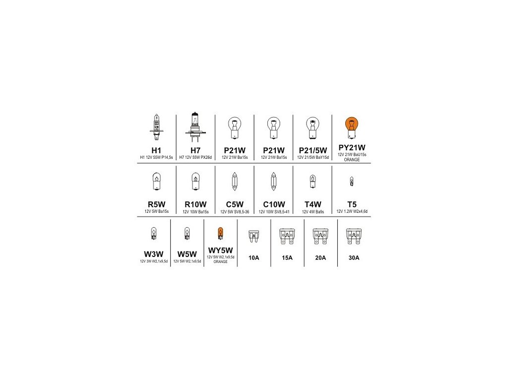 Uzavíratelný kufřík se sadou náhradních žárovek 12V a pojistek, homologace E.