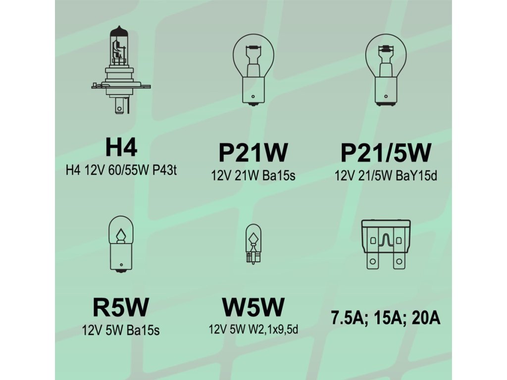 Univerzální servisní sada žárovek a pojistek v plastové krabičce.