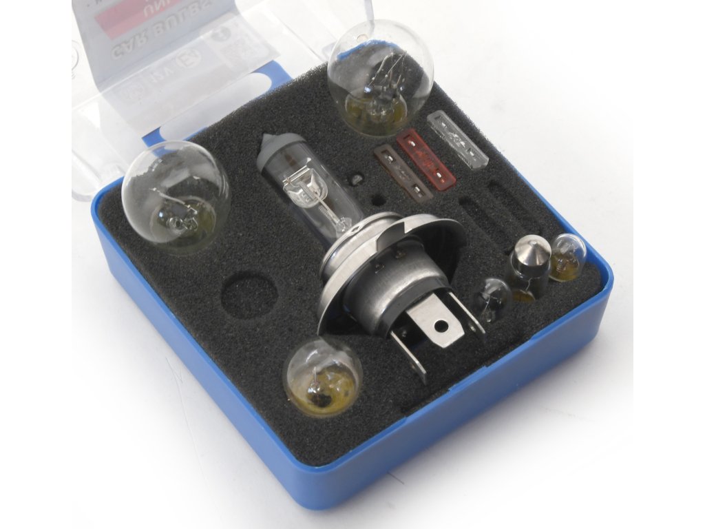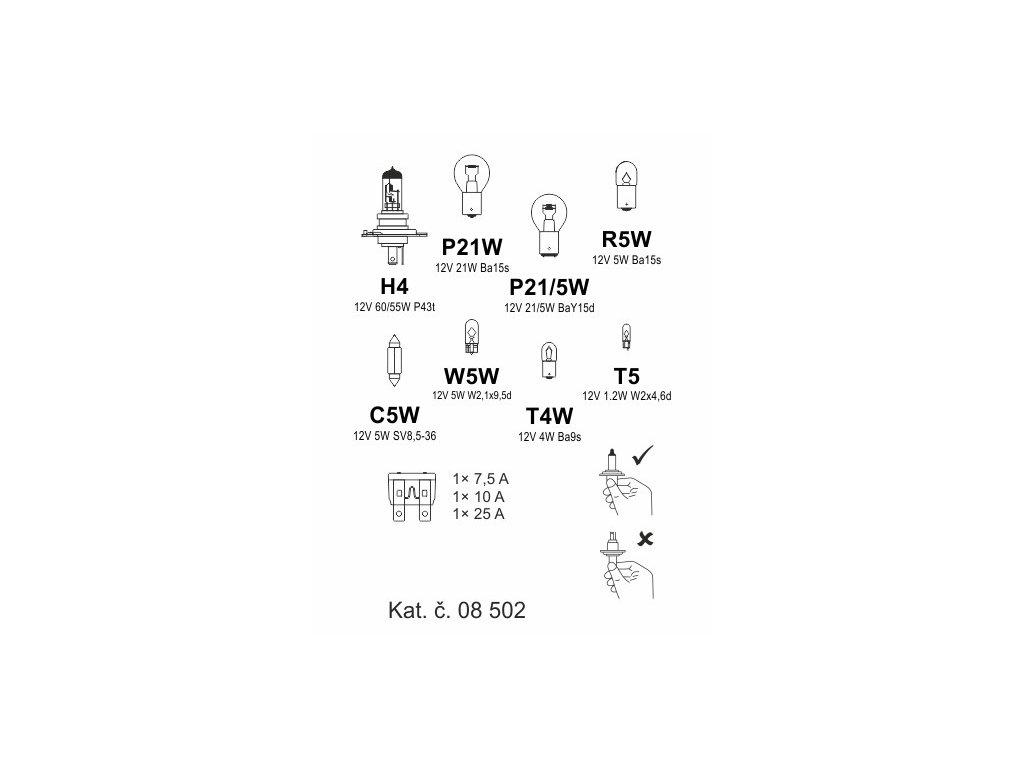 Plastová krabička náhradních autožárovek a pojistek, homologace E.