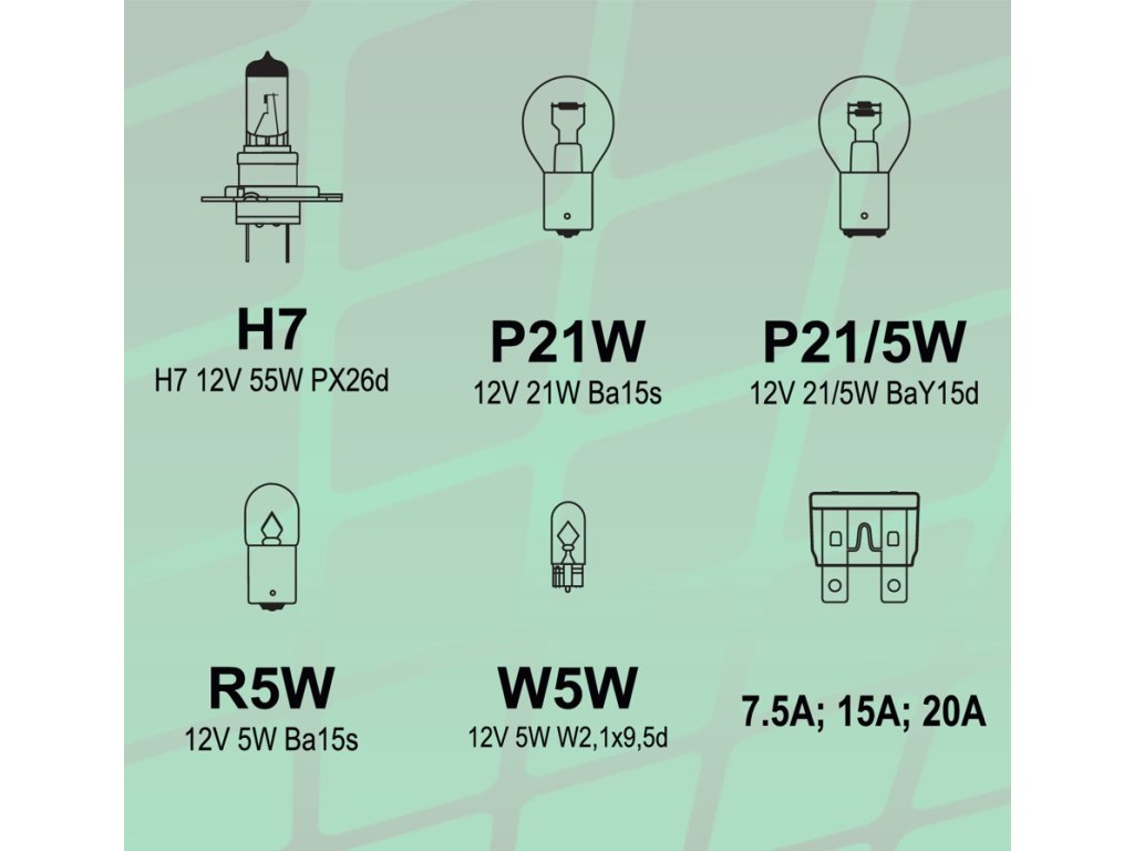 Univerzální servisní sada žárovek a pojistek v plastové krabičce.