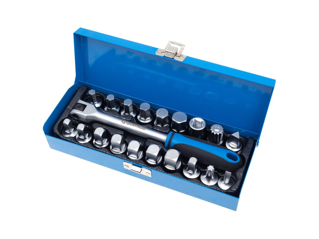 Speciální klíče (hlavice) na šrouby olejových van, s klíčem, 20dílná sada, v plechové krabičce, univerzální – QUATROS QS60019B