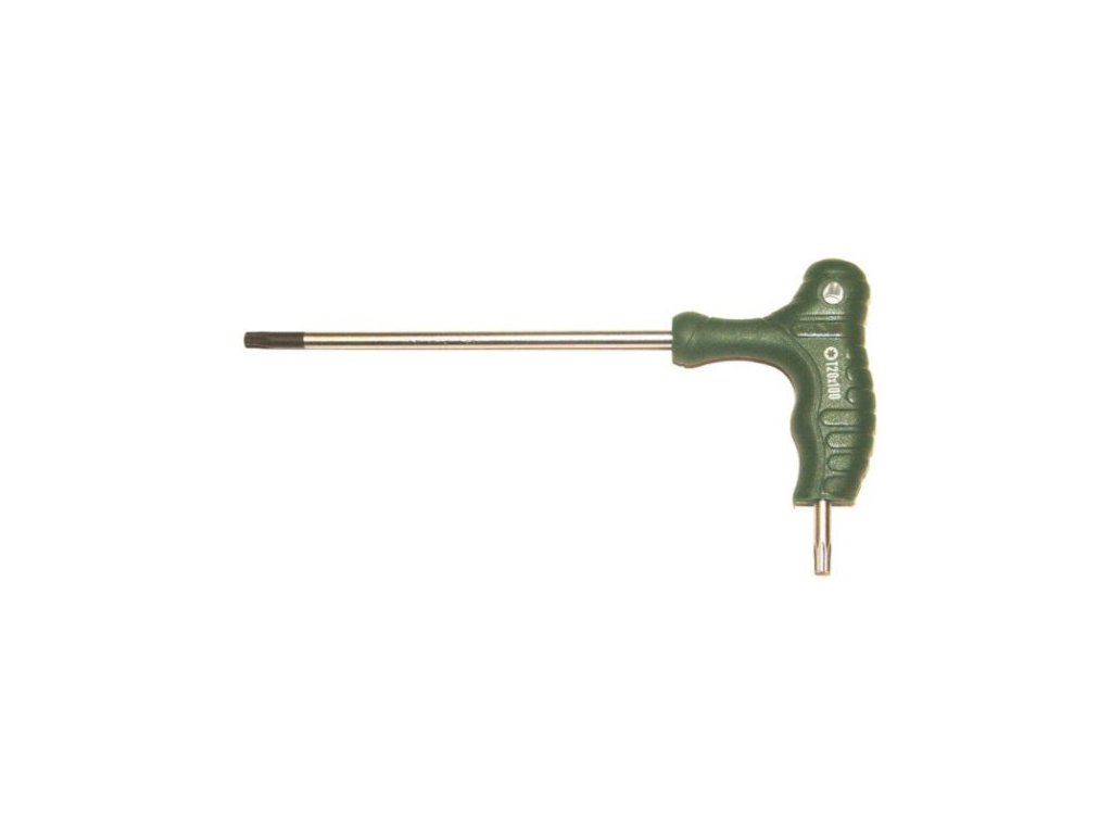 Ergonomická T‑rukojeť pro pohodlnou práci. Delší dřík má plný konec (klasický TORX), kratší je s otvorem (na bezpečnostní Torx šrouby typu Torx Tamper-proof – TORX TT).