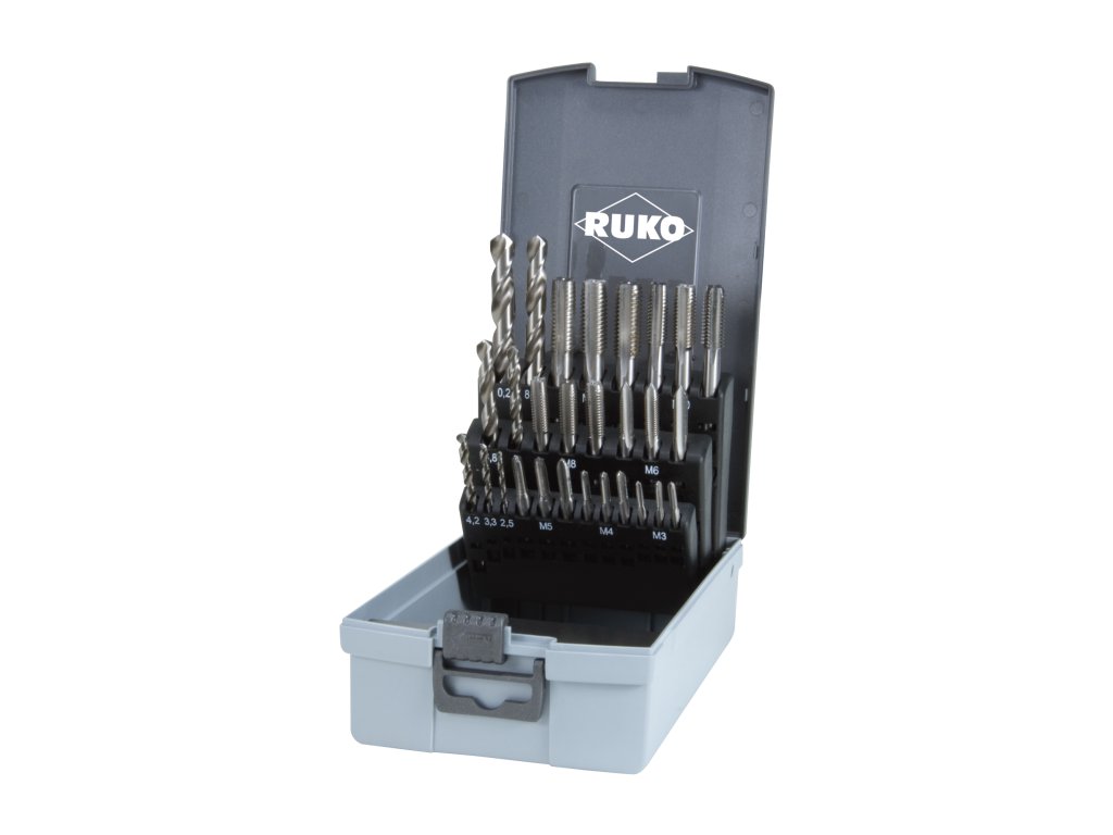 Sada závitníků a vrtáků RUKO 245003RO Komplexní souprava na opravu závitů. Obsahuje 28 kusů: 3x závitník M3 3x závitník M4 3x závitník M5 3x závitník M6 3x závitník M8 3x závitník M10 3x závitník M12 7x vrták DIN 338: 2,5 - 3,3 - 4,2 - 5,0 - 6,8 - 8,5 - 10,2 mm Závitníky vyrobeny z rychlořezné oceli HSS (High-Speed Steel), odpovídají normě DIN 352. Dodáváno v uzavíratelné kazetě.Doplňkové parametry