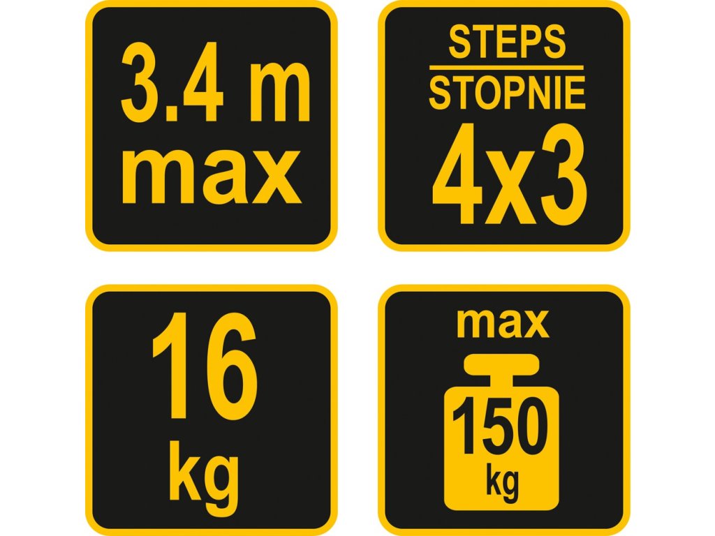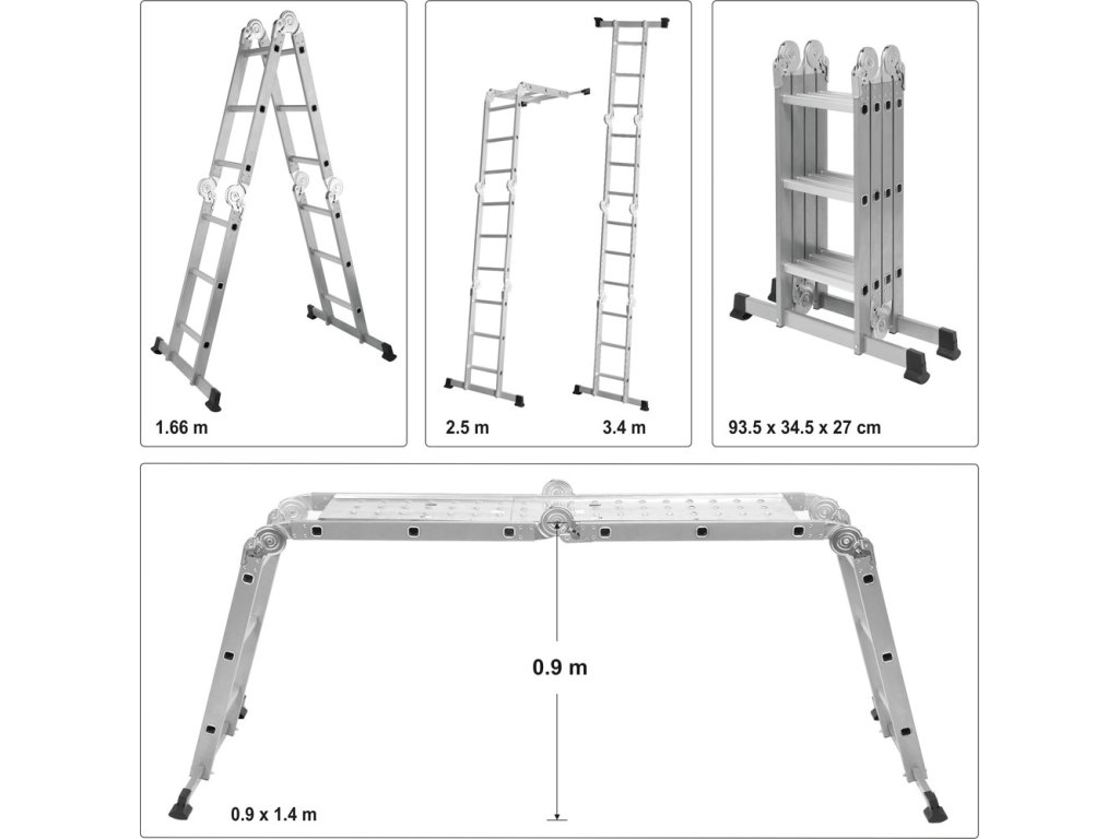 Víceúčelový skládací žebřík, 4x3 příčky, výška až 3,4 metru.