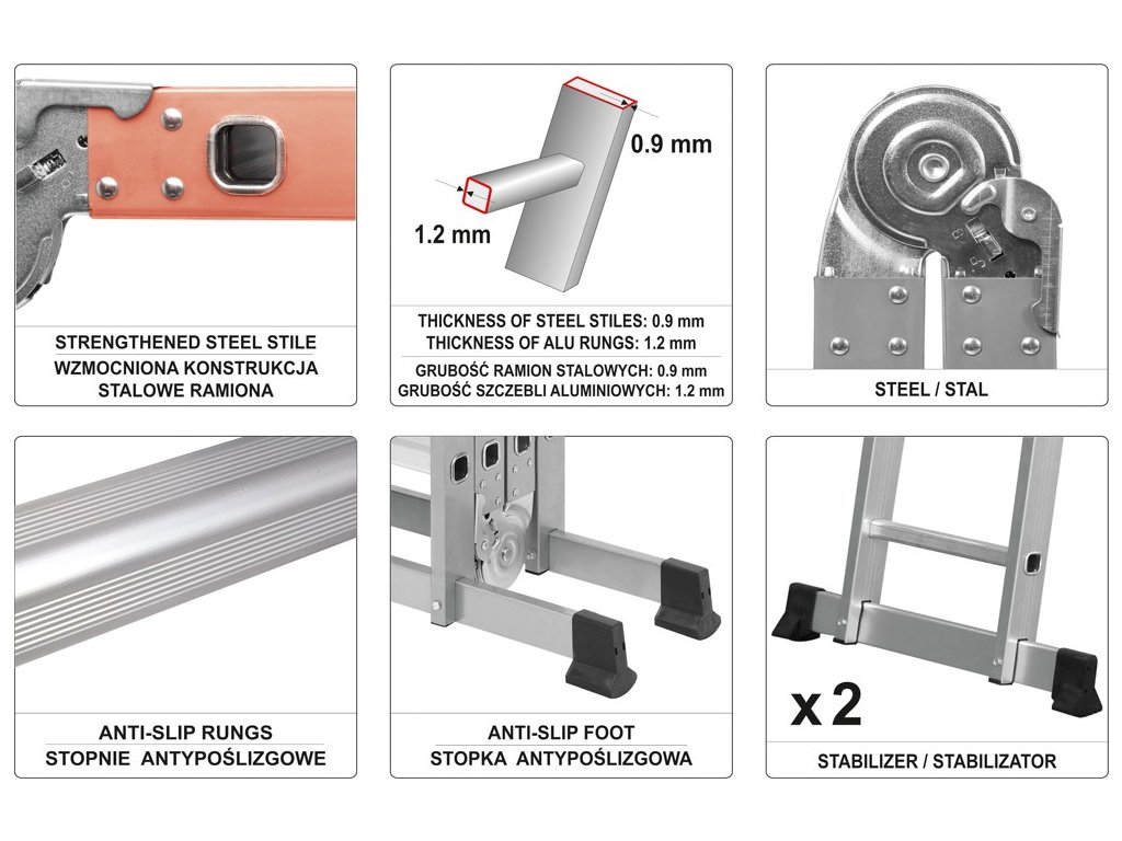 Boky žebříku jsou vyrobeny z ocelových profilů 0,9 mm, které jsou pevnější než hliník stejného provedení. Příčky jsou pak hliníkové o tlouště stěny 1,2 mm a jejich povrchy je protiskluzový. Pro vysokou stabilitu je na každé straně žebříku stabilizátor s gumovými nohami.