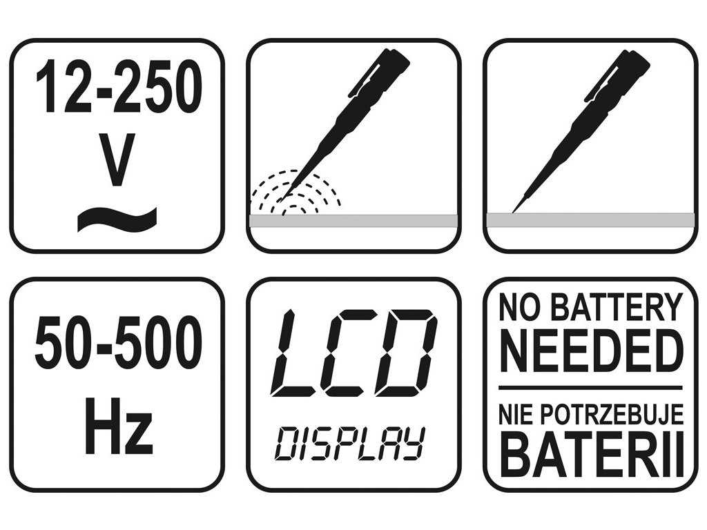 Zkoušečka napětí v rozsahu 12 - 250 V. Indikátor je určen pro mechaniky, kontrolory provádějící údržbu elektrických instalací i pro „běžné uživatele domácích zásuvek“.